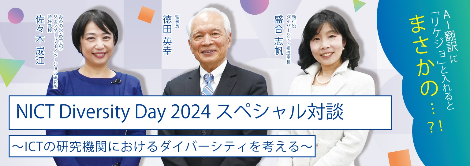 NICTダイバーシティ推進室は国際女性デーの2024年3月8日、「NICT Diversity Day 2024」を開催し、ゲストにお茶の水女子大学ジェンダード・イノベーション研究所特任教授・佐々木成江先生(ご所属は対談当時)をお迎えして、徳田英幸理事長、盛合志帆執行役・ダイバーシティ推進室長とのスペシャル対談を行ないました。「AIとジェンダーバイアス」「マジョリティ・マイノリティを考える」「研究機関で行える改革、考え方」「NICTが日本のダイバーシティ推進に対して貢献できること」の4つをテーマに、組織・研究機関におけるダイバーシティについて考えました。
