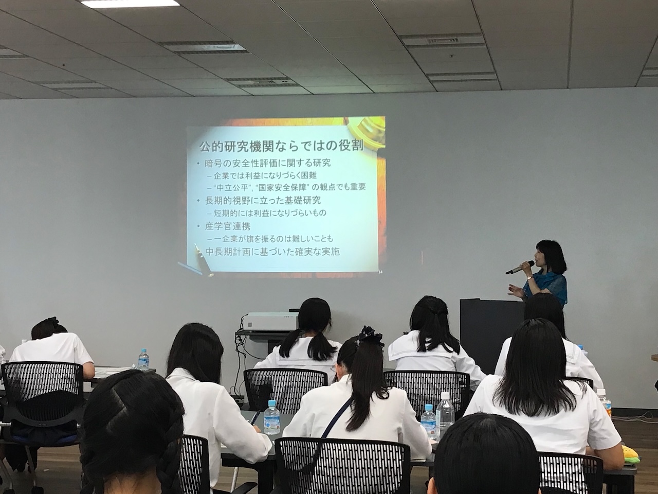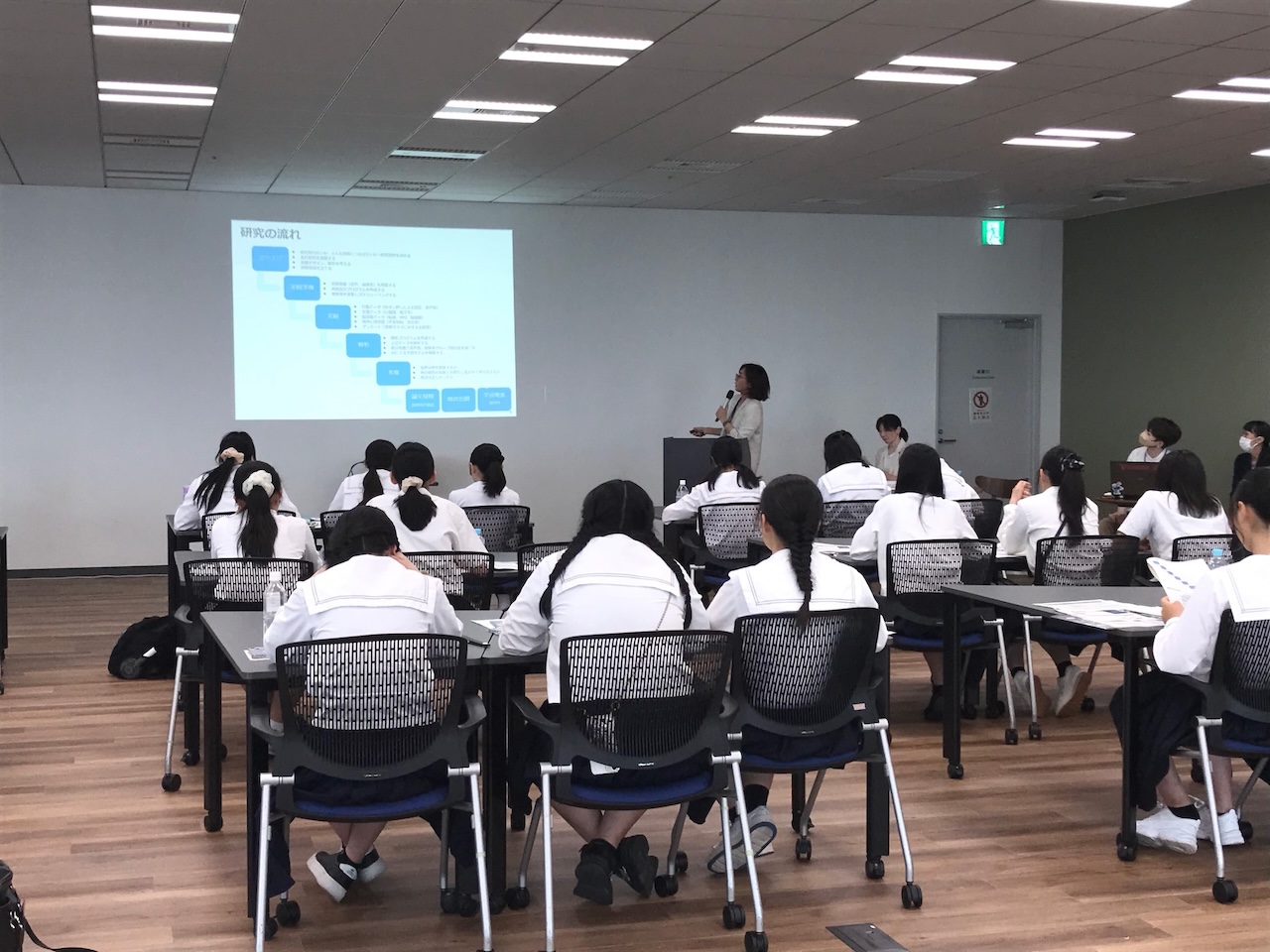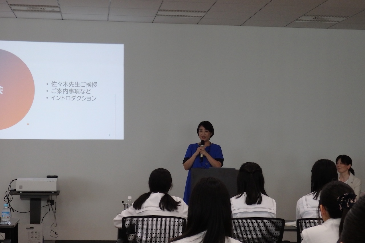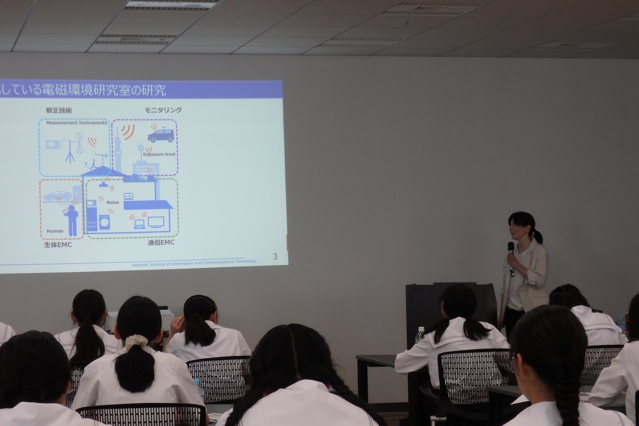 NICTでのキャリアトークイベントは、NICT日本橋イノベーションセンターにて実施、26名の女子高校生が参加しました。冒頭、ゲストの佐々木成江特任准教授(東京大学大学院)からご挨拶をいただいた後、 ダイバーシティ推進室長である盛合志帆執行役、水野麻弥研究マネージャー、井原綾主任研究員が研究者として登壇。