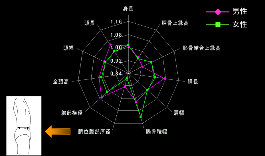 数値モデルを日本人の平均体型と比較した結果、体型計測時の体位の違い(数値モデル:臥位、日本人平均値:立位)の影響により、臍位腹部厚径について男女ともに若干偏差が大きくなっているものの、数値モデルと日本人の平均体 型との偏差の平均値は5%以下であり、これらのモデルが日本人の平均体型にほぼ一致していることがわかります。(図中の数値が1.0に近いほど一致)