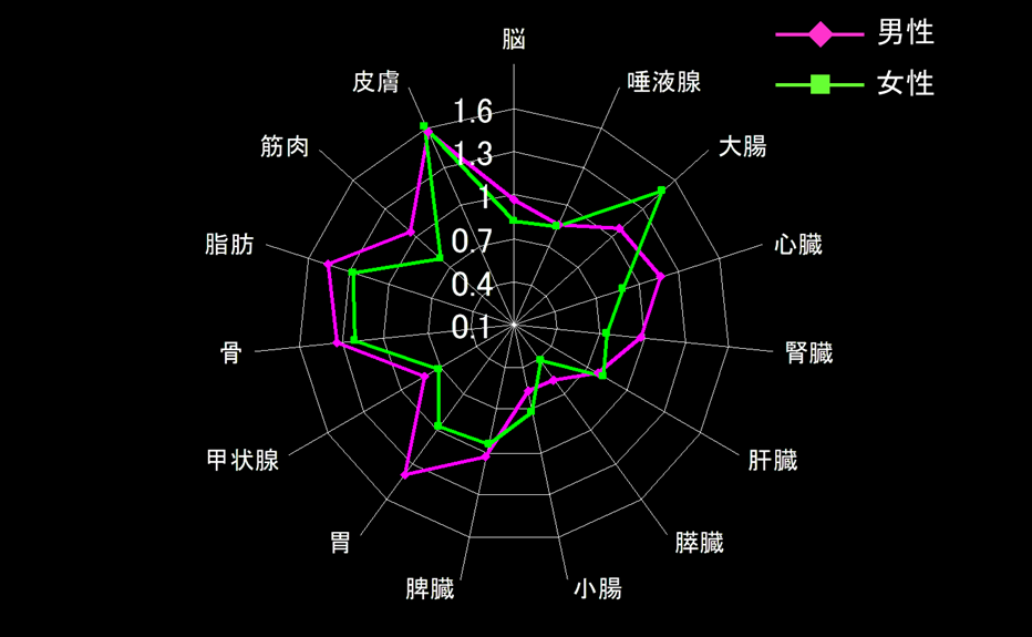 臓器は、若干個人差が大きいものの、男性で6割、女性で8割の組織・臓器が平均値との偏差30%以内にありました。
