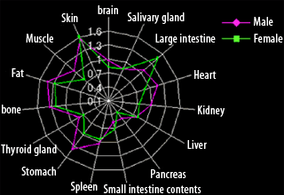 Although the organs showed certain individual differences, 60% of the tissues and organs of men and 80% of those of women differed from the average values by within 30%.
