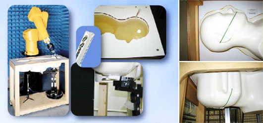 SAR is measured by filling phantom liquid that has the same electrical properties as those of the human body in a container made in the shape of the human body, and scanning the inside using an SAR probe. In consideration of the situation in which the mobile phone is actually used, we conduct measurements under a variety of conditions, determine maximum SAR, and make evaluations. The SAR measurement system is comprised of the following three items.