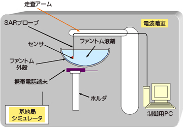 ファントムの近くに測定する端末を設置し、実際に電波を放射した状態で、ファントム内部のSARを測定します。
