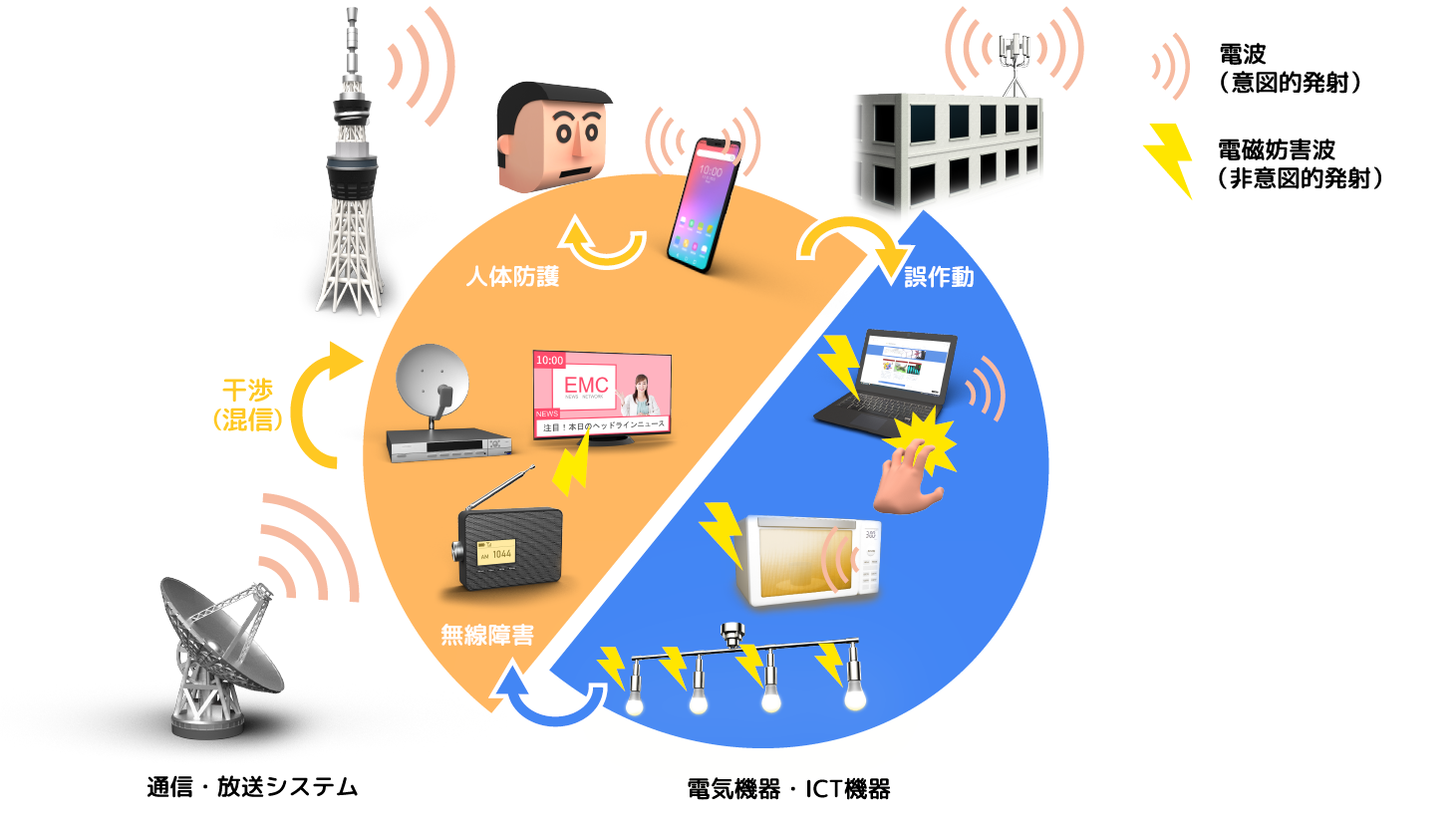 我々の身の回りには、さまざまな電磁波が存在しており、これらによって作られる環境を電磁環境と言い、その性質(周波数スペクトル等)は場所や時間によって複雑に変動しています。この電磁環境の中で我々は様々な機器・システムを利用していますが、それらが電磁波を介して相互に悪影響を及ぼさず正常に利用できること(能力)をEMC(電磁(的)両立性)と言います。