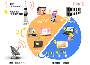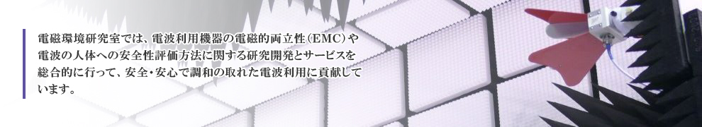 電波利用の周波数拡大や、スマートコミュニティ・スマートグリッドの普及にともなう電磁環境問題を防止するために、超高周波電磁波を精密に計測・較正する技術の研究開発や、広帯域電磁妨害波の計測技術、電磁波による情報通信機器への影響評価技術の研究開発を行い、国内外の技術基準等へ貢献しています。
