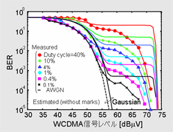 妨害波のAPD測定結果から、その妨害波が干渉を与えるデジタル無線通信システムの通信品質劣化を予測した結果を示します。下の左図は実験系の簡略図、右側はBER測定値(マーカー付きの線)とAPD測定値から予測した推定BER値を示しています。この推定は最悪条件のもとで行なわれているので、BER測定値よりもBER推測値の方が全体的に大きな値となります。