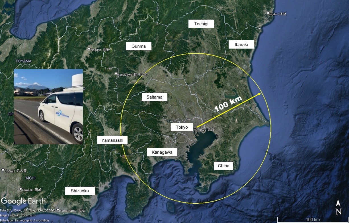 The results of measurements taken in FY2021 within a radius of 100 km centered on Nihonbashi, Tokyo (measurement distance: approx. 15,000 km) are shown here.