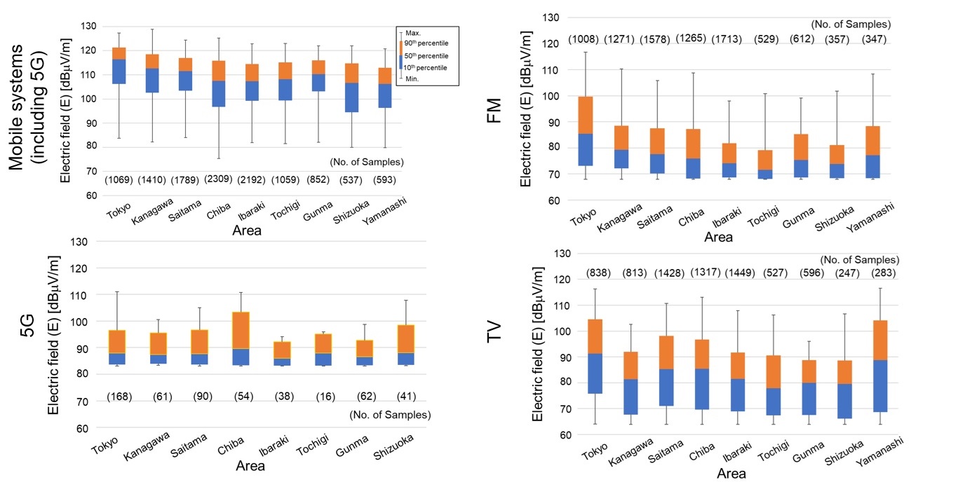 - Figure 1 shows the box and whisker plot of the E-field strength from mobile phone base stations with and without 5G, and broadcast transmission towers of FM and TV with the number of samples for each prefecture. The E-field strengths in the graphs are levels averaged within Basic Grid Square※1. It can be seen that the E-field strengths from FM/TV broadcast transmission towers are lower than those from mobile phone base stations. The E-field strength of all systems is higher in Tokyo than in other prefectures. However, even in areas with the highest E-field strength, it is less than 0.32% of the value specified in Radio Radiation Protection Guidelines※2.