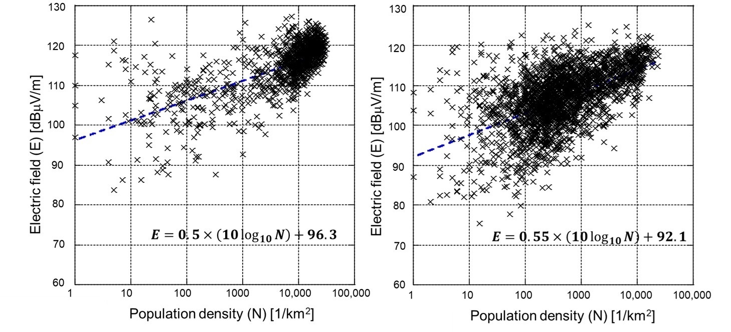- Figure 2 is a scatter plot that shows the relationship between population density and E-field strength from mobile phone base stations, including 5G in Tokyo and Chiba Prefecture. The E-field strength is positively correlated with the power of the population density.