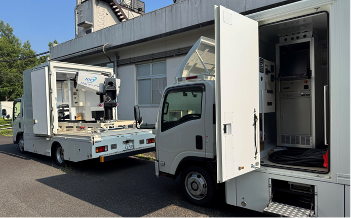 2023年度に上記の可搬型光地上局をベースとして、さらなる小型化をはかり運用の簡便化を目指した可搬型光地上局も新たに準備しました。 この新しい可搬型光地上局は望遠鏡を搭載した光通信地上局車両と電源・各種制御機器を搭載した制御用車両の2台編成とし、RF(Radio Frequency:無線周波数)用平面アンテナも搭載可能な機能を備えています。