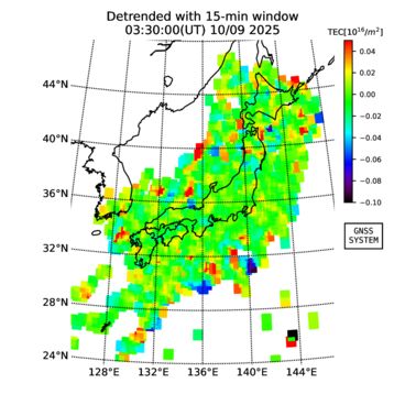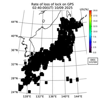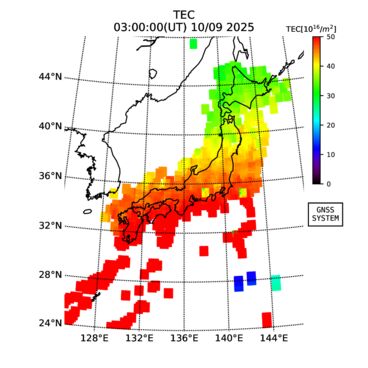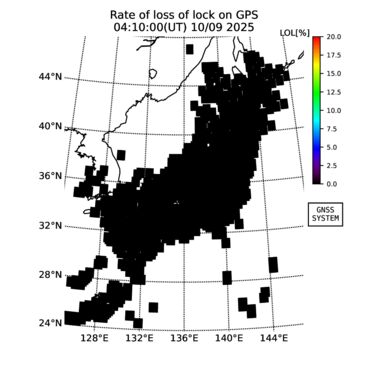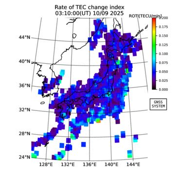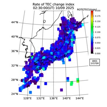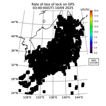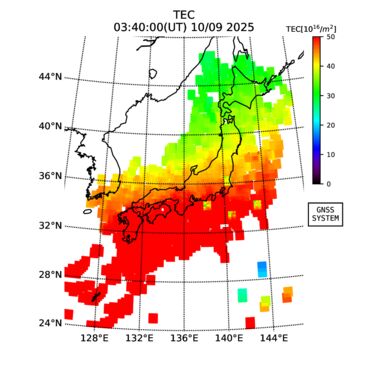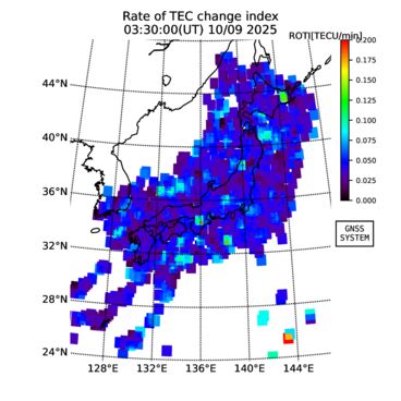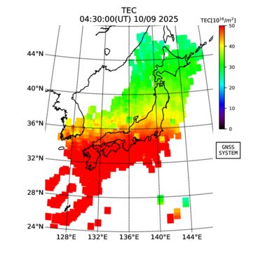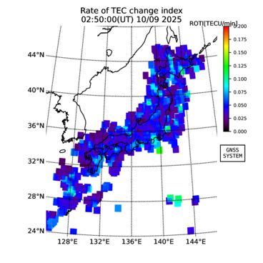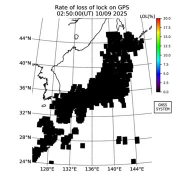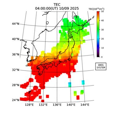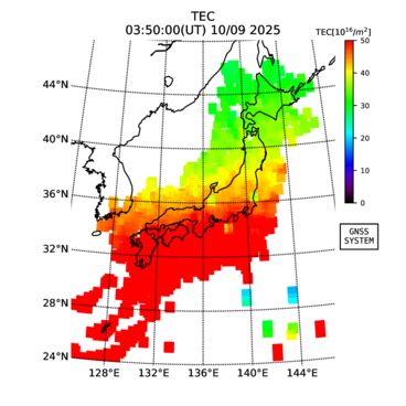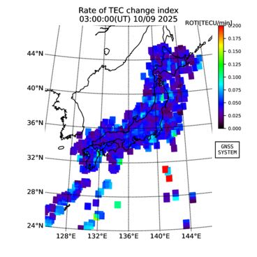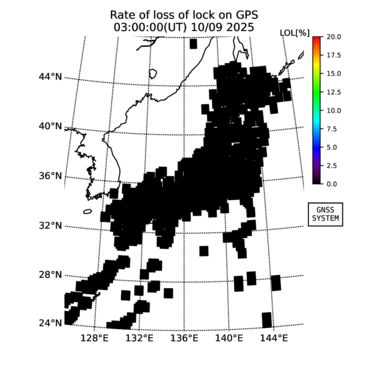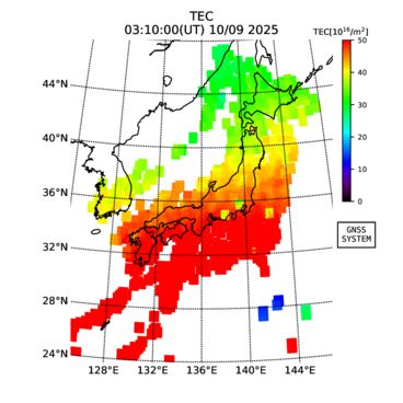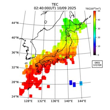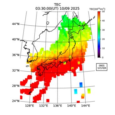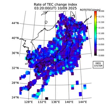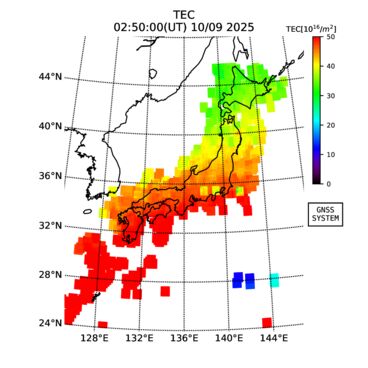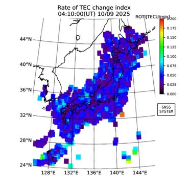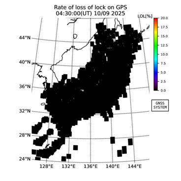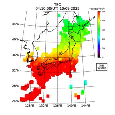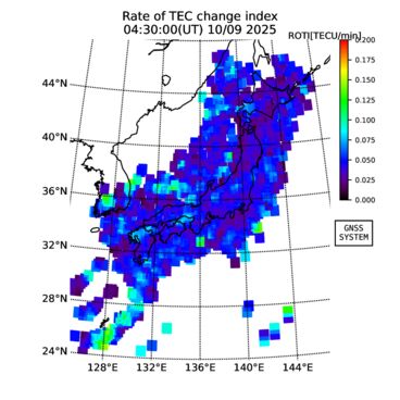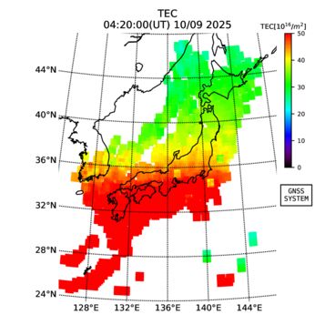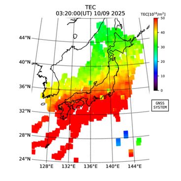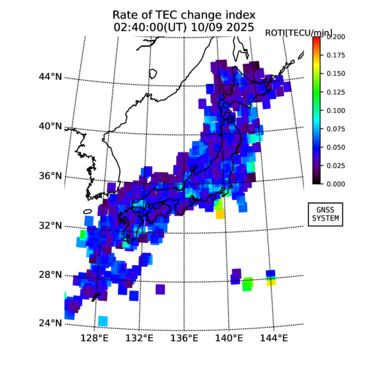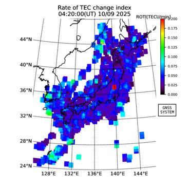 リアルタイム全電子数(TEC)、TEC変動成分、電離圏電子密度擾乱指数(ROTI)、GPS信号ロック損失率(LOL)の各マップは、電子航法研究所、京都大学、及び名古屋大学の協力のもと、国土地理院のGPS受信機網(GEONET)データを利用してNICTが算出し作成したものです。TEC、TEC変動成分、ROTI、LOLマップは速報値であり、正確な値で無い可能性があることにご注意ください。このページに対するご質問・ご意見等は、
