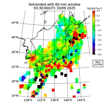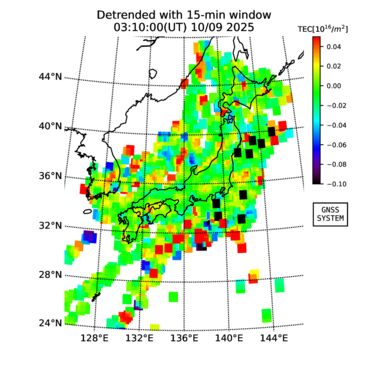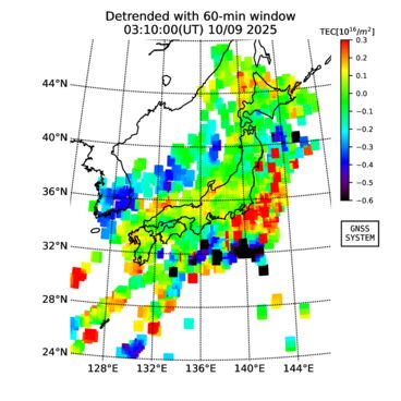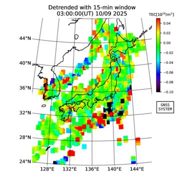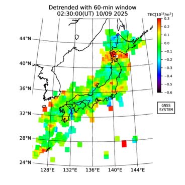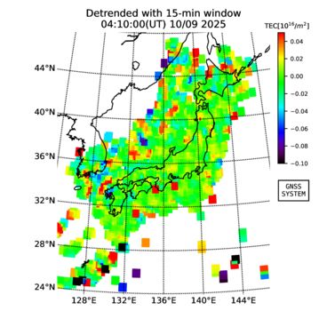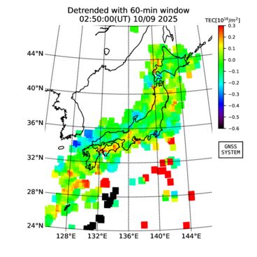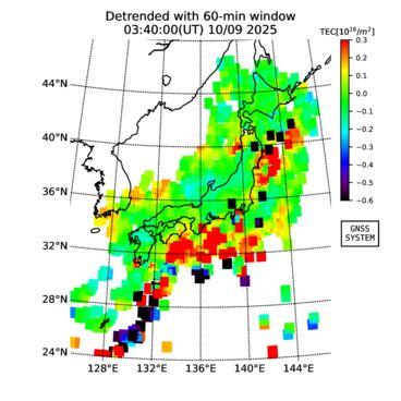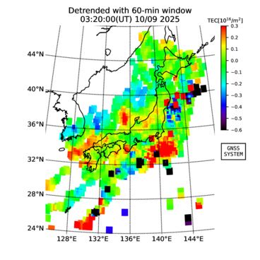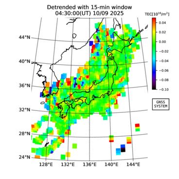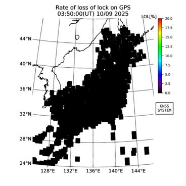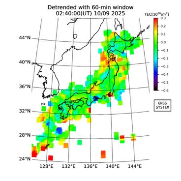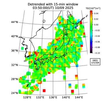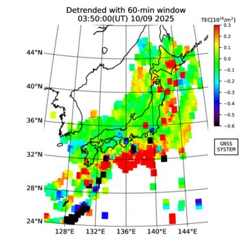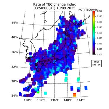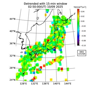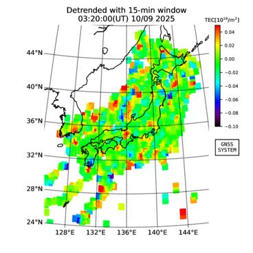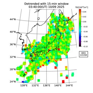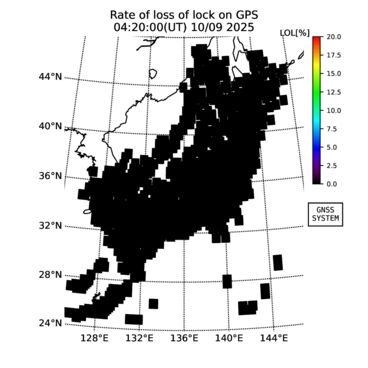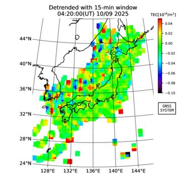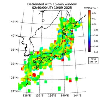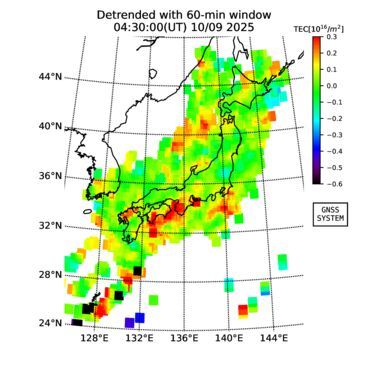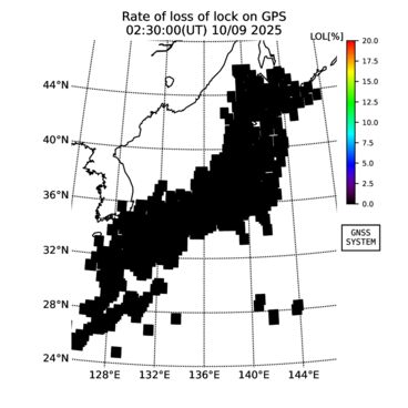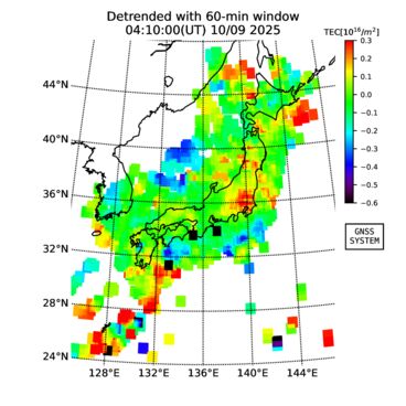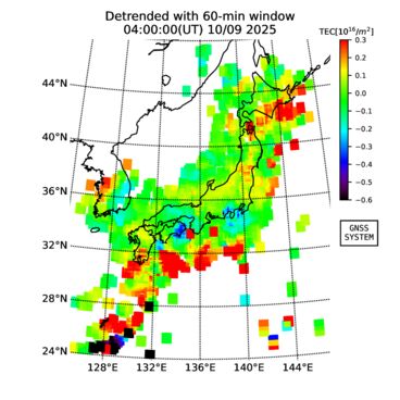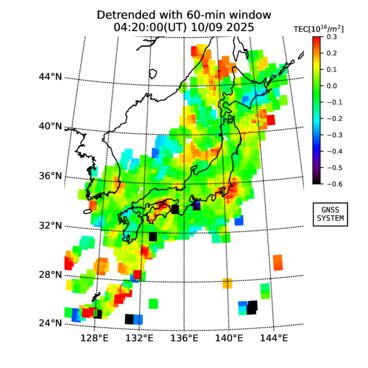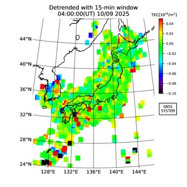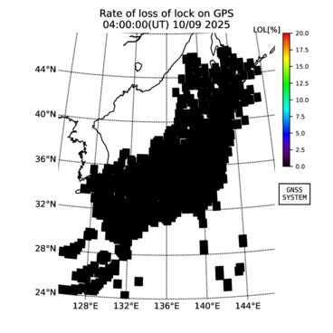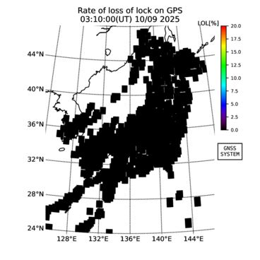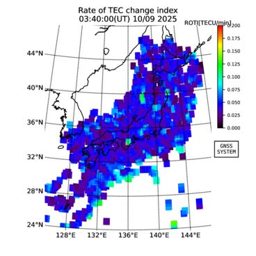 リアルタイム全電子数(TEC)、TEC変動成分、電離圏電子密度擾乱指数(ROTI)、GPS信号ロック損失率(LOL)の各マップは、電子航法研究所、京都大学、及び名古屋大学の協力のもと、国土地理院のGPS受信機網(GEONET)データを利用してNICTが算出し作成したものです。TEC、TEC変動成分、ROTI、LOLマップは速報値であり、正確な値で無い可能性があることにご注意ください。このページに対するご質問・ご意見等は、