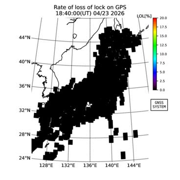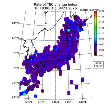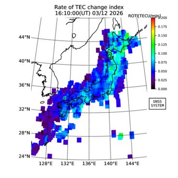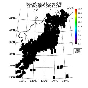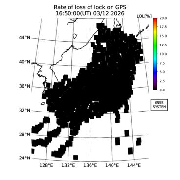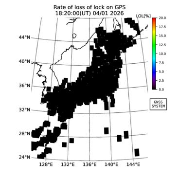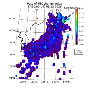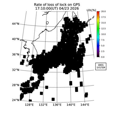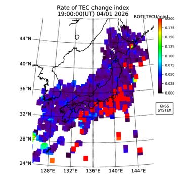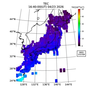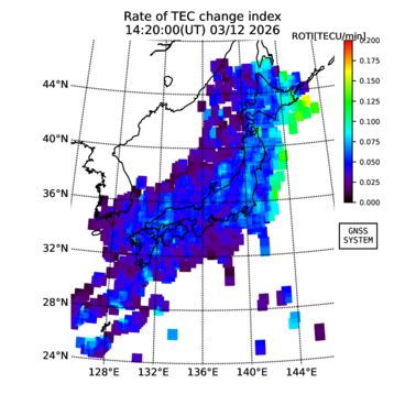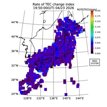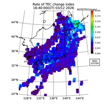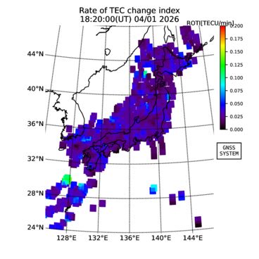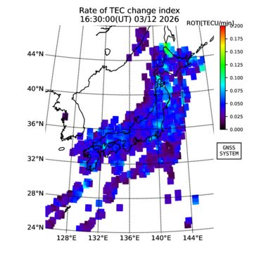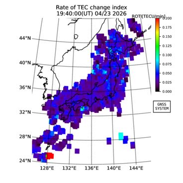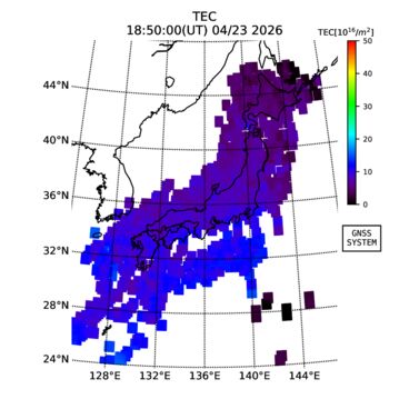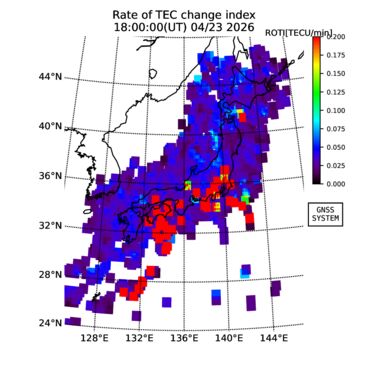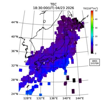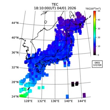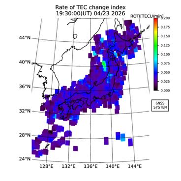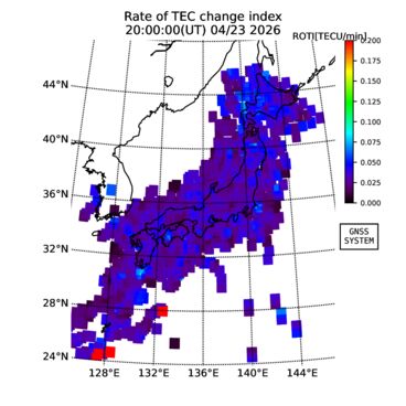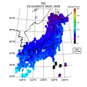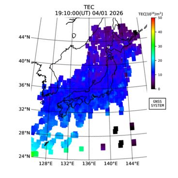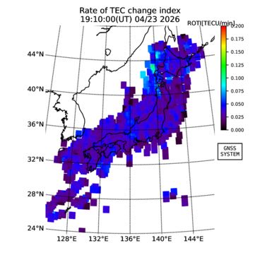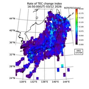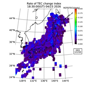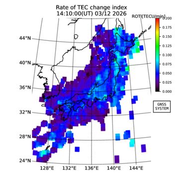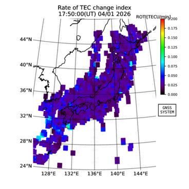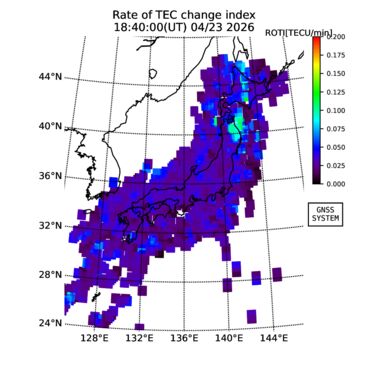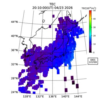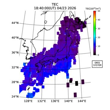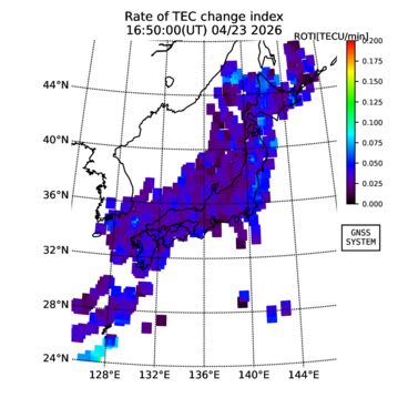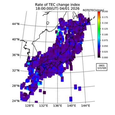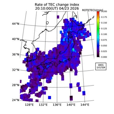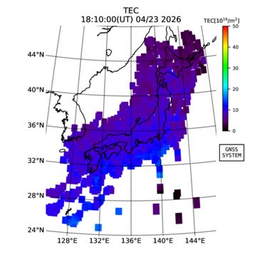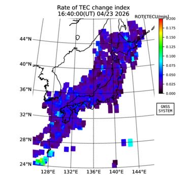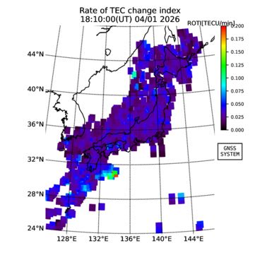 | リアルタイム全電子数(TEC)、TEC変動成分、電離圏電子密度擾乱指数(ROTI)、GPS信号ロック損失率(LOL)の各マップは、電子航法研究所、京都大学、及び名古屋大学の協力のもと、国土地理院のGPS受信機網(GEONET)データを利用してNICTが算出し作成したものです。TEC、TEC変動成分、ROTI、LOLマップは速報値であり、正確な値で無い可能性があることにご注意ください。このページに対するご質問・ご意見等は、