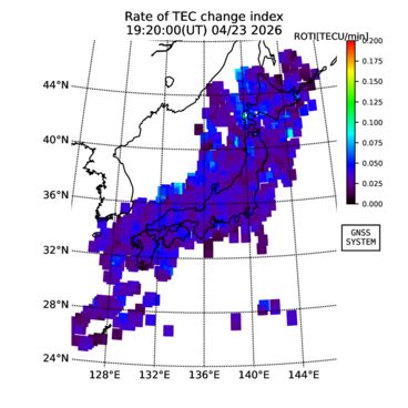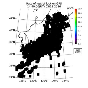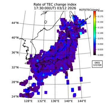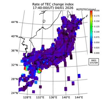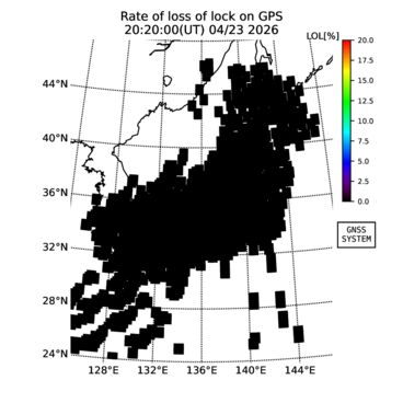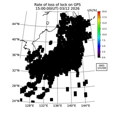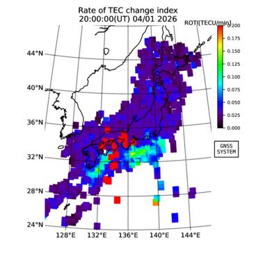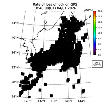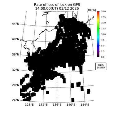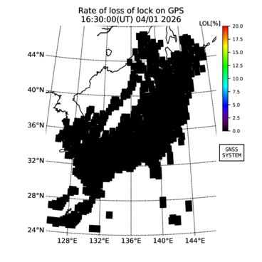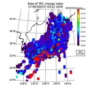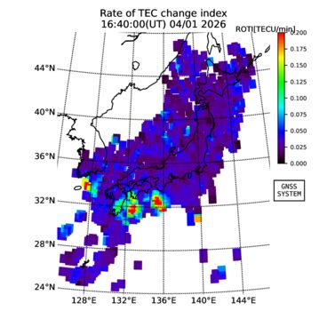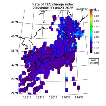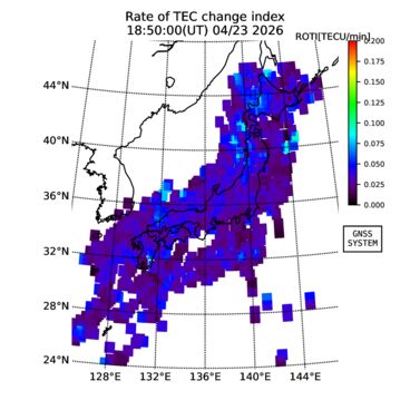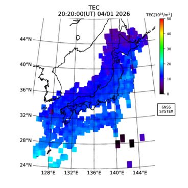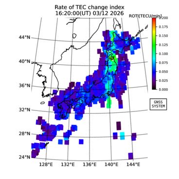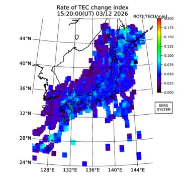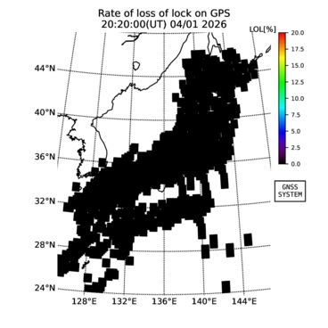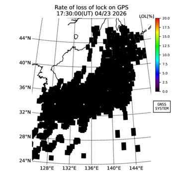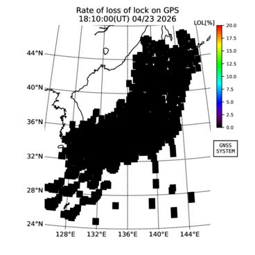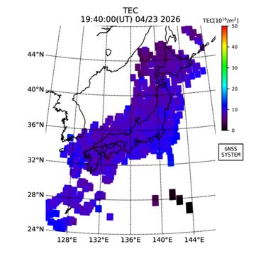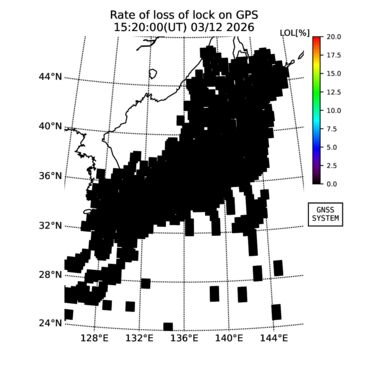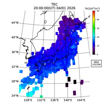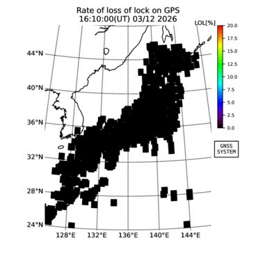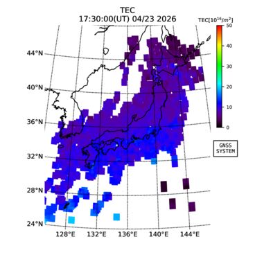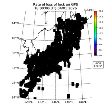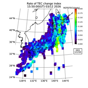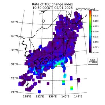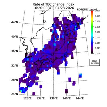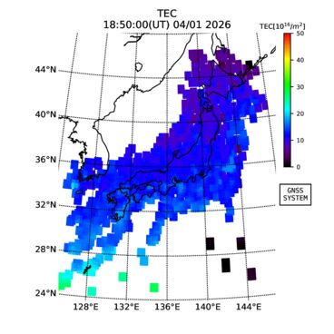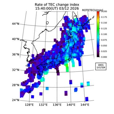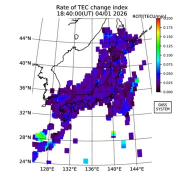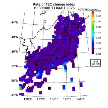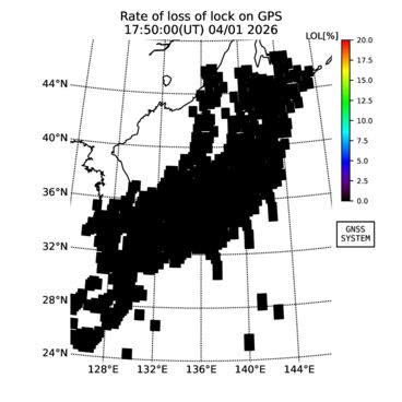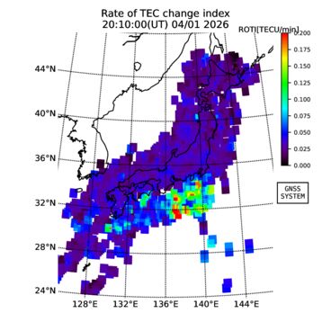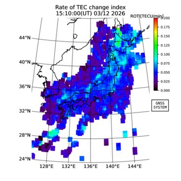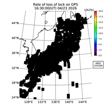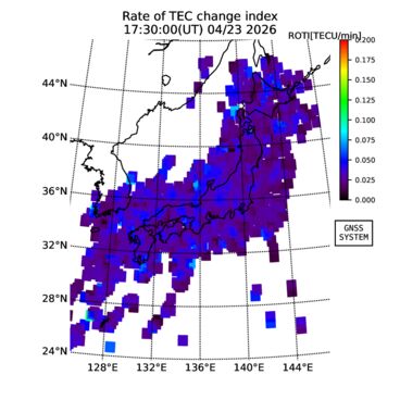 | リアルタイム全電子数(TEC)、TEC変動成分、電離圏電子密度擾乱指数(ROTI)、GPS信号ロック損失率(LOL)の各マップは、電子航法研究所、京都大学、及び名古屋大学の協力のもと、国土地理院のGPS受信機網(GEONET)データを利用してNICTが算出し作成したものです。TEC、TEC変動成分、ROTI、LOLマップは速報値であり、正確な値で無い可能性があることにご注意ください。このページに対するご質問・ご意見等は、