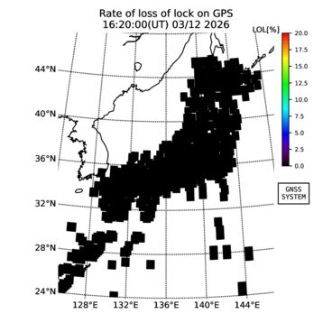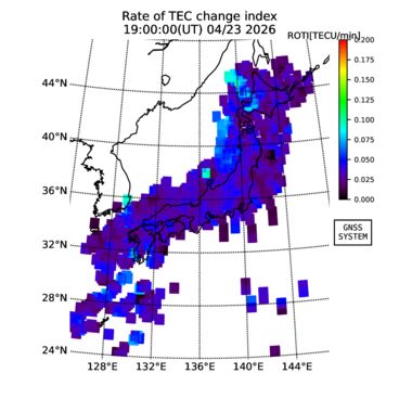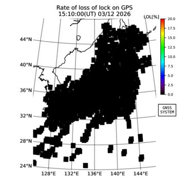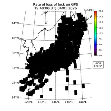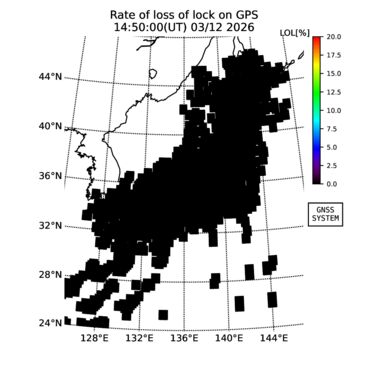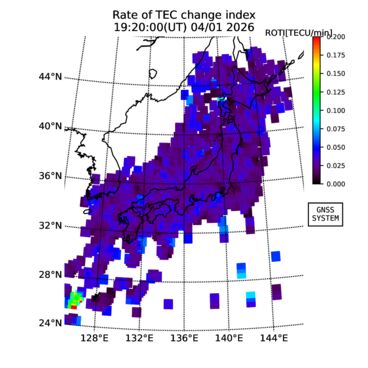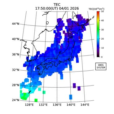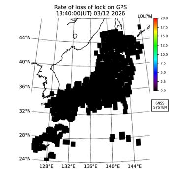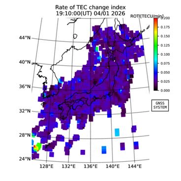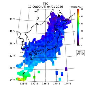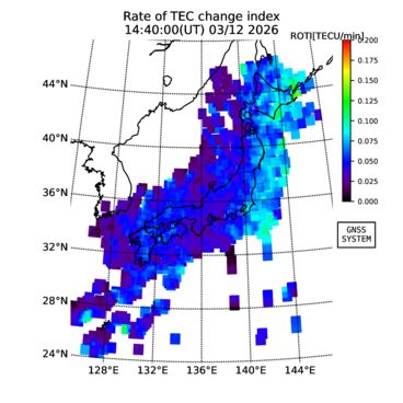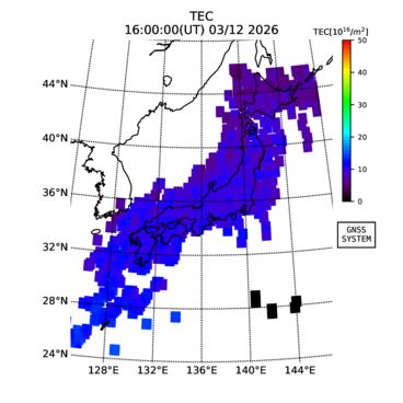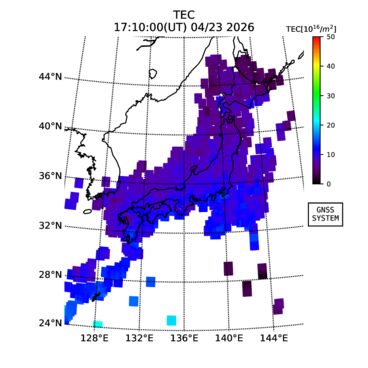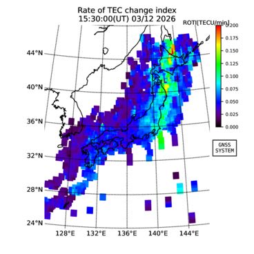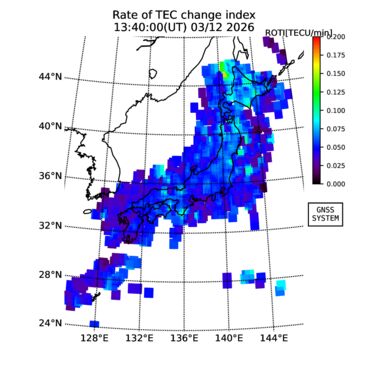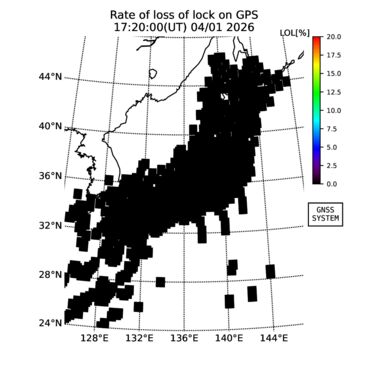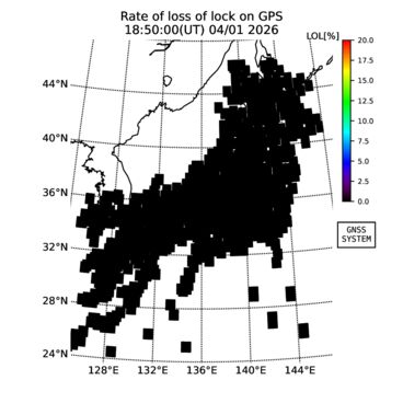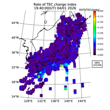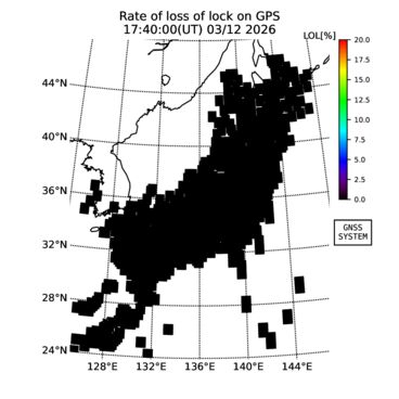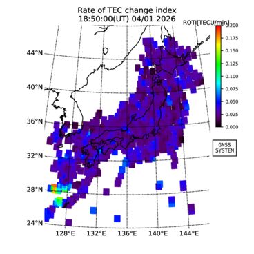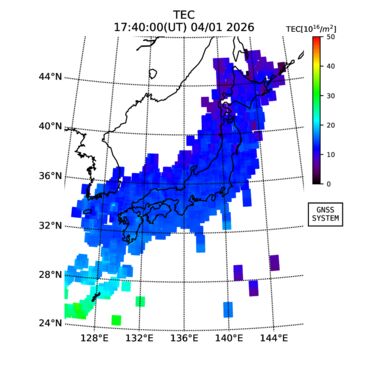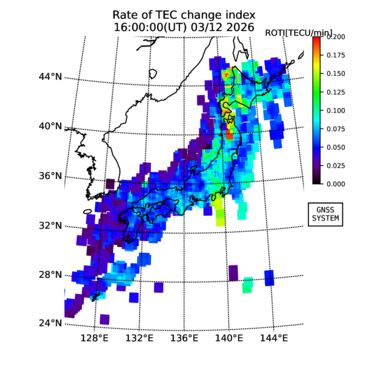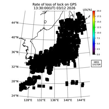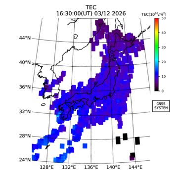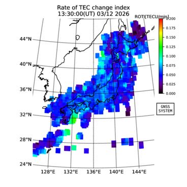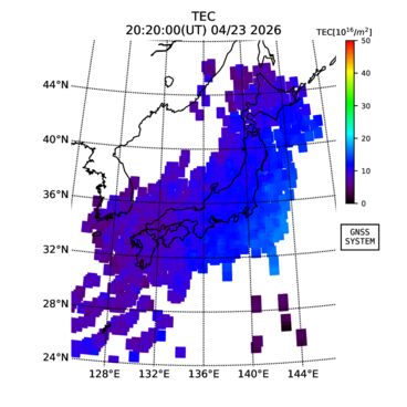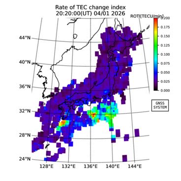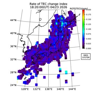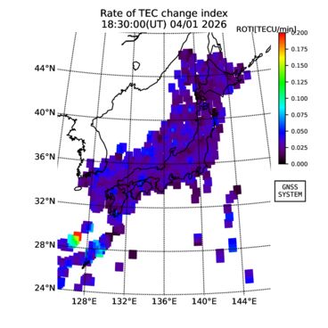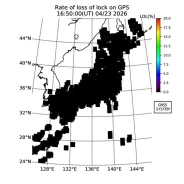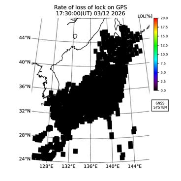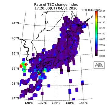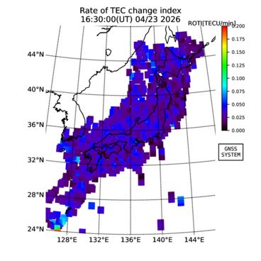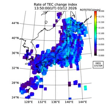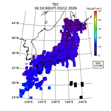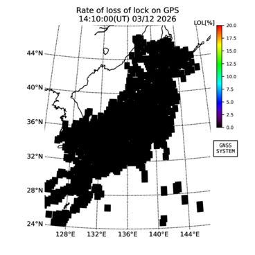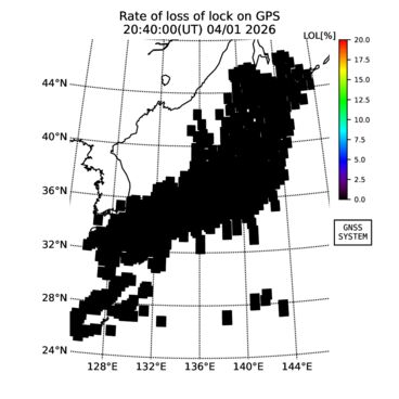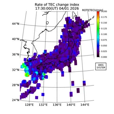 | リアルタイム全電子数(TEC)、TEC変動成分、電離圏電子密度擾乱指数(ROTI)、GPS信号ロック損失率(LOL)の各マップは、電子航法研究所、京都大学、及び名古屋大学の協力のもと、国土地理院のGPS受信機網(GEONET)データを利用してNICTが算出し作成したものです。TEC、TEC変動成分、ROTI、LOLマップは速報値であり、正確な値で無い可能性があることにご注意ください。このページに対するご質問・ご意見等は、