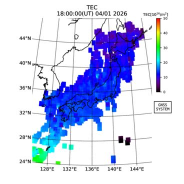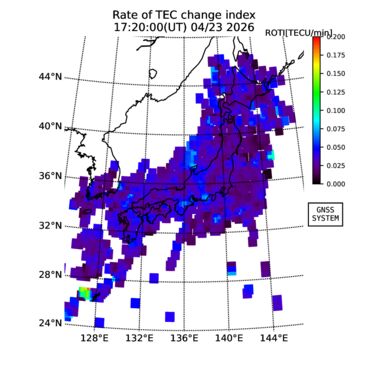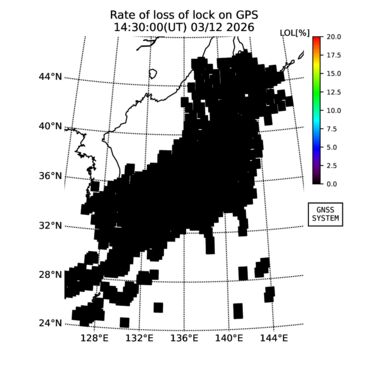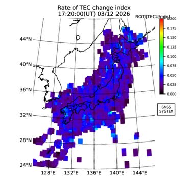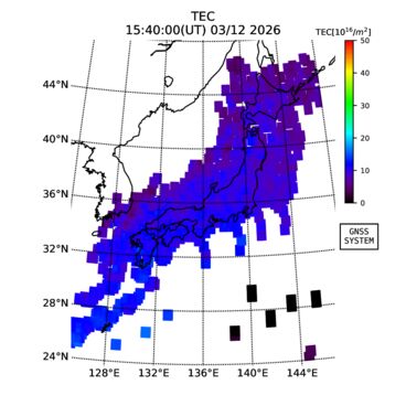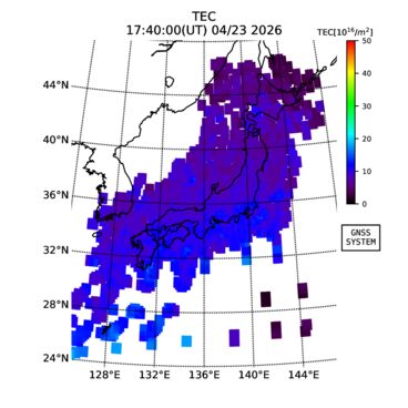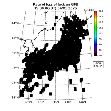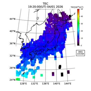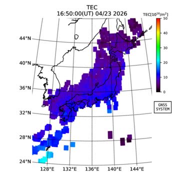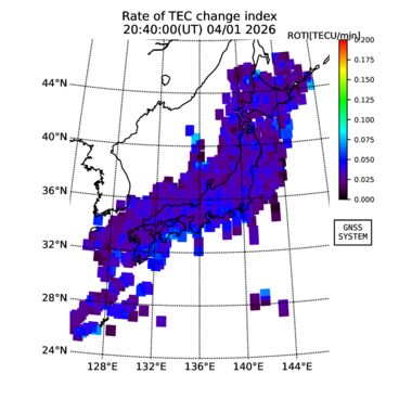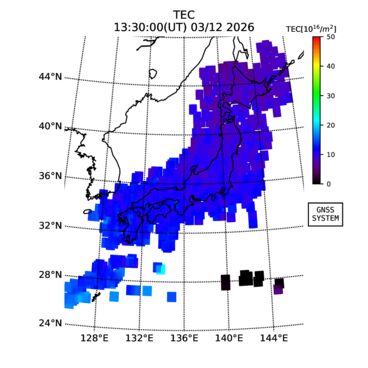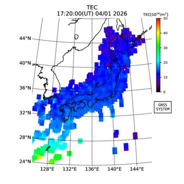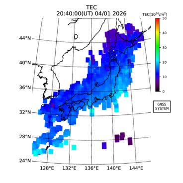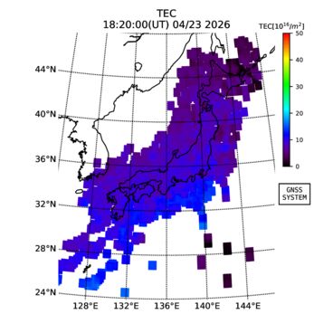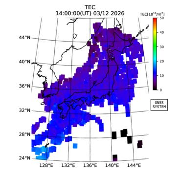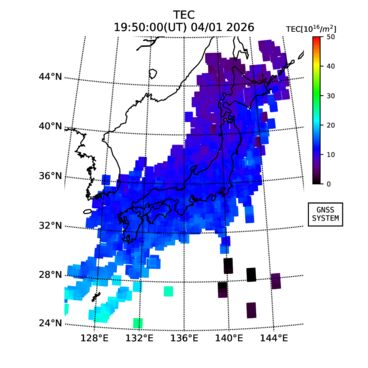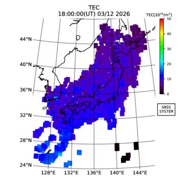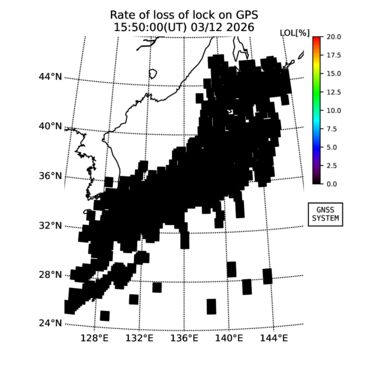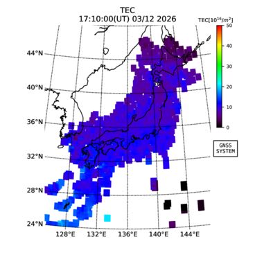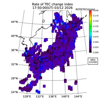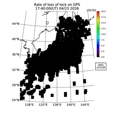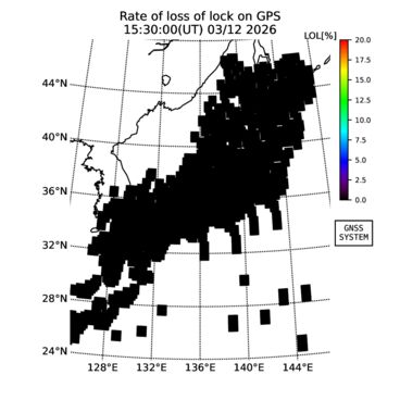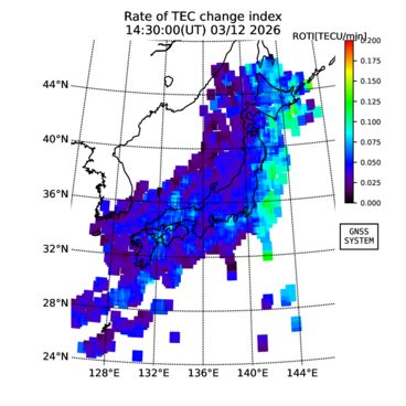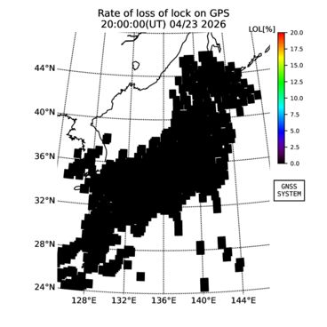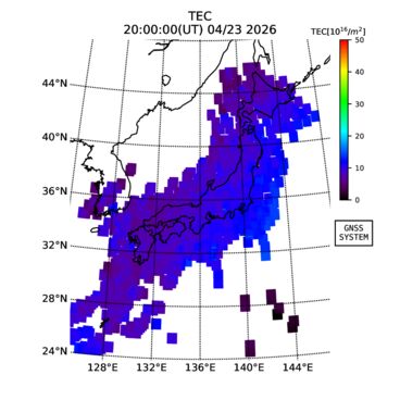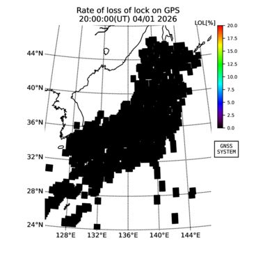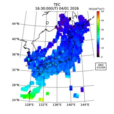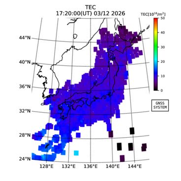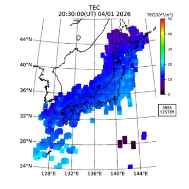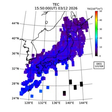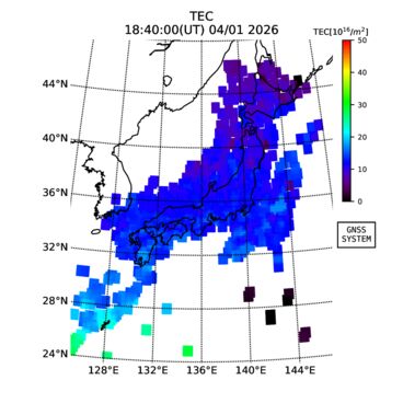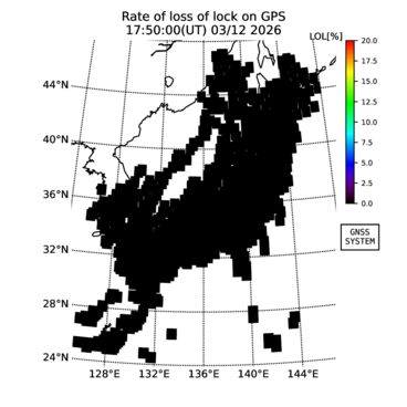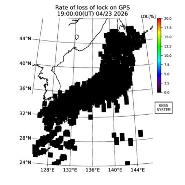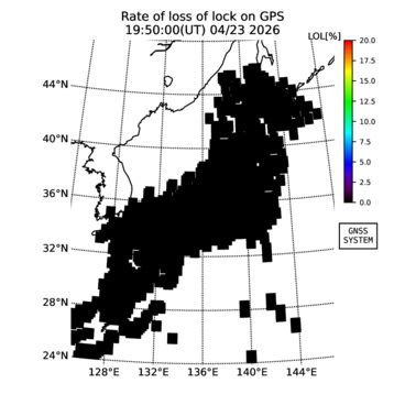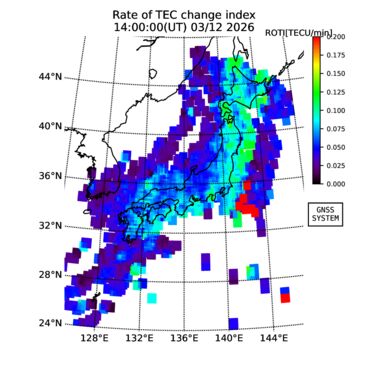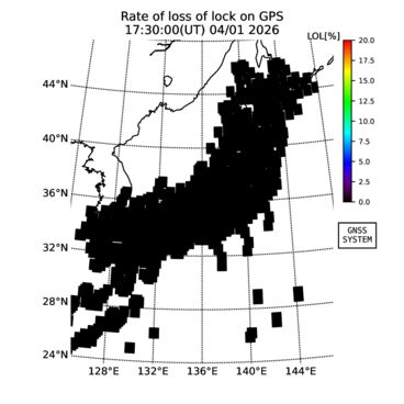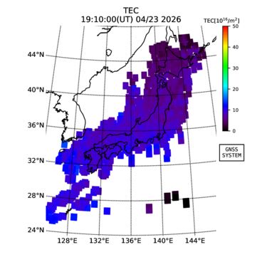 | リアルタイム全電子数(TEC)、TEC変動成分、電離圏電子密度擾乱指数(ROTI)、GPS信号ロック損失率(LOL)の各マップは、電子航法研究所、京都大学、及び名古屋大学の協力のもと、国土地理院のGPS受信機網(GEONET)データを利用してNICTが算出し作成したものです。TEC、TEC変動成分、ROTI、LOLマップは速報値であり、正確な値で無い可能性があることにご注意ください。このページに対するご質問・ご意見等は、