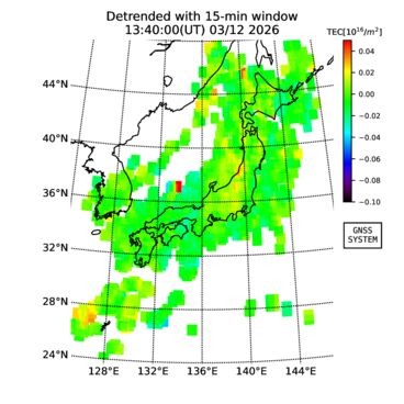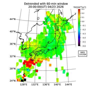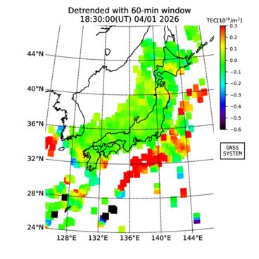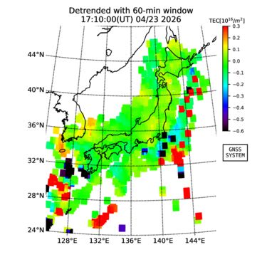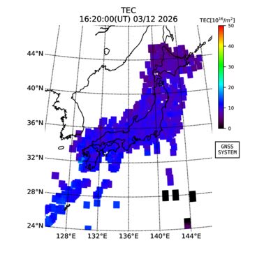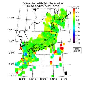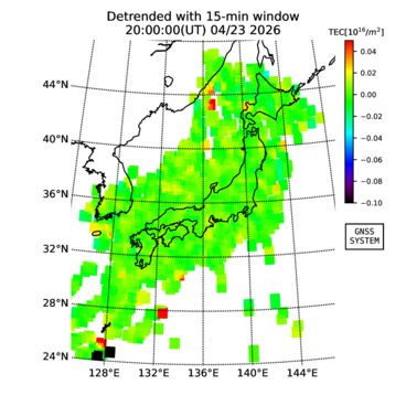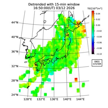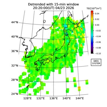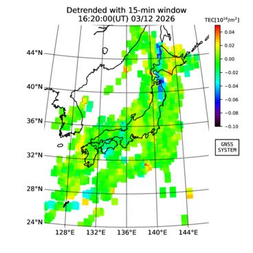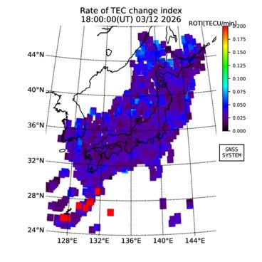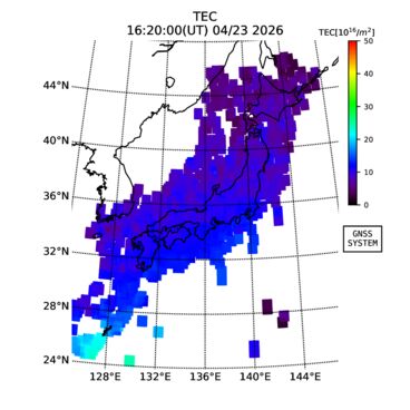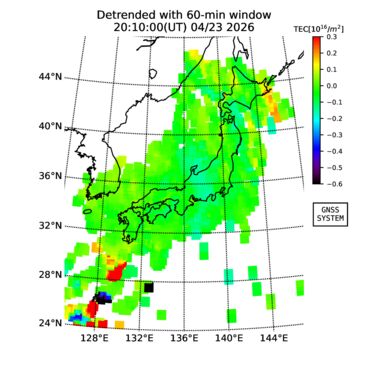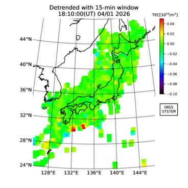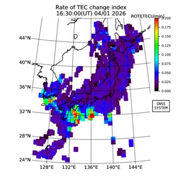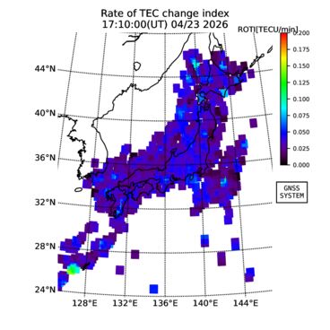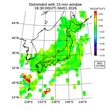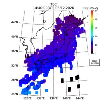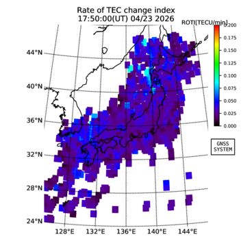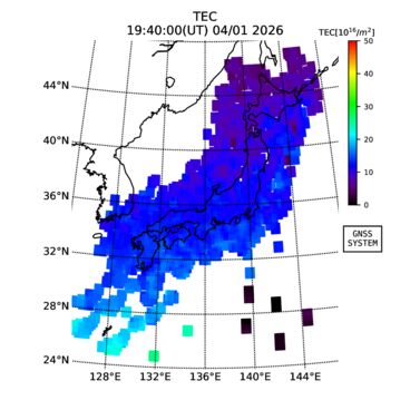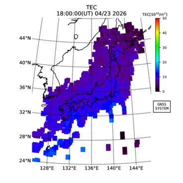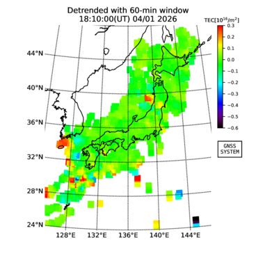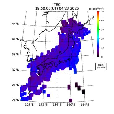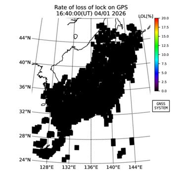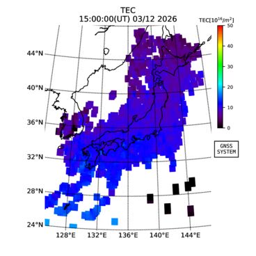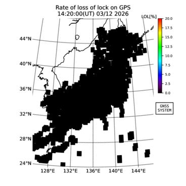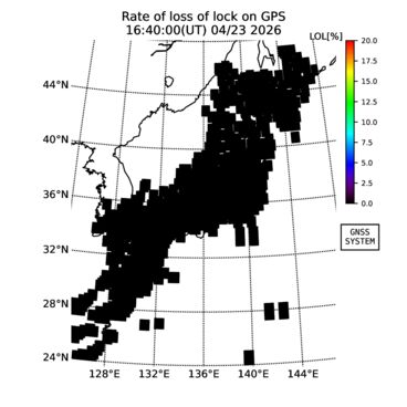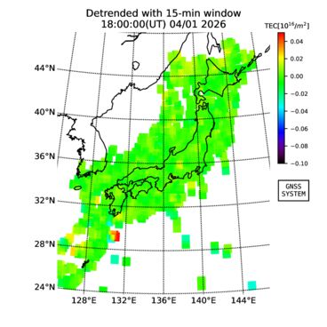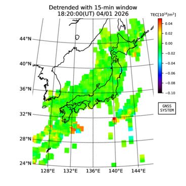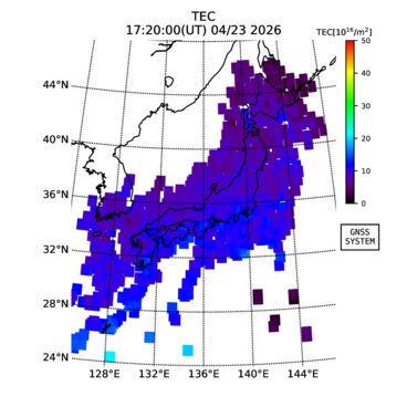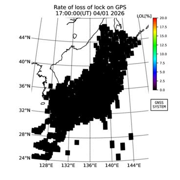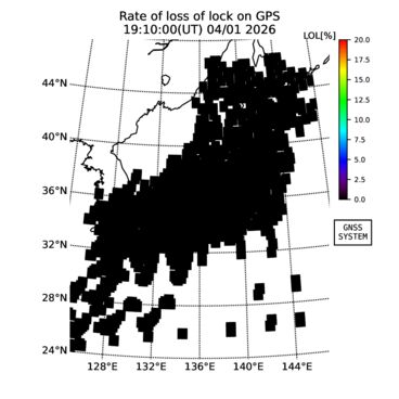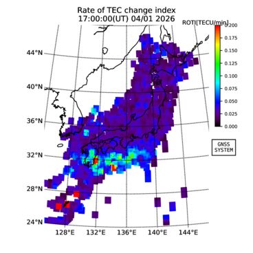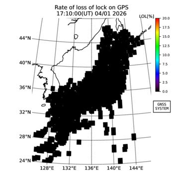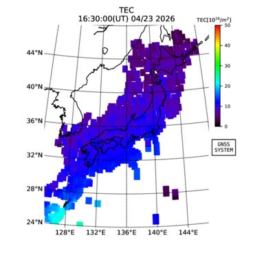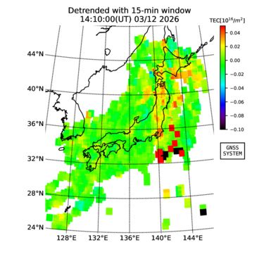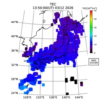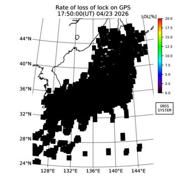 | リアルタイム全電子数(TEC)、TEC変動成分、電離圏電子密度擾乱指数(ROTI)、GPS信号ロック損失率(LOL)の各マップは、電子航法研究所、京都大学、及び名古屋大学の協力のもと、国土地理院のGPS受信機網(GEONET)データを利用してNICTが算出し作成したものです。TEC、TEC変動成分、ROTI、LOLマップは速報値であり、正確な値で無い可能性があることにご注意ください。このページに対するご質問・ご意見等は、