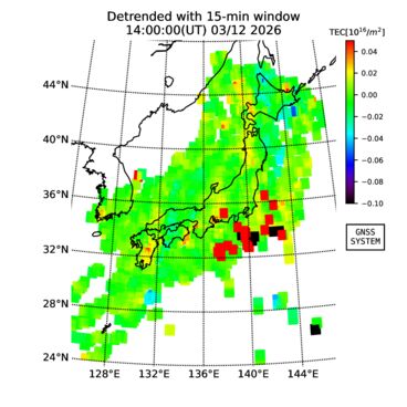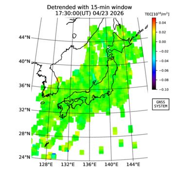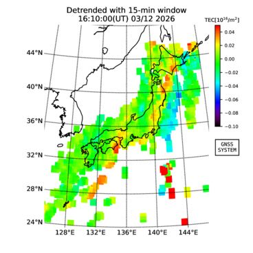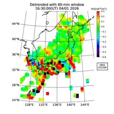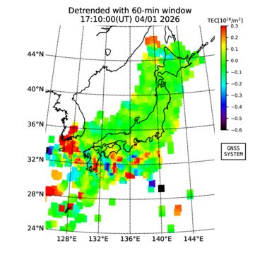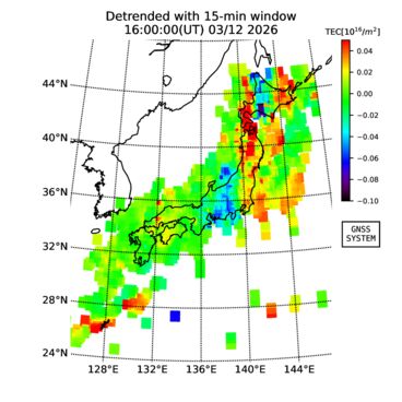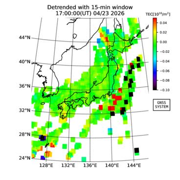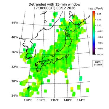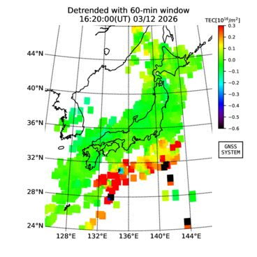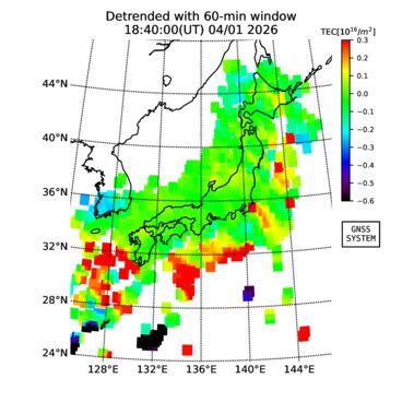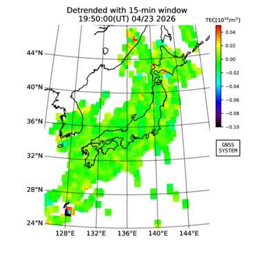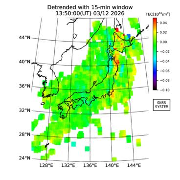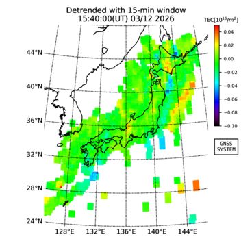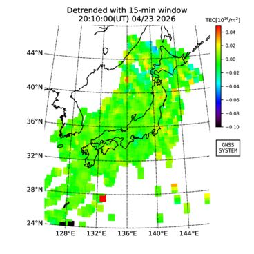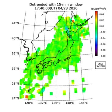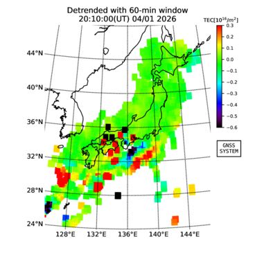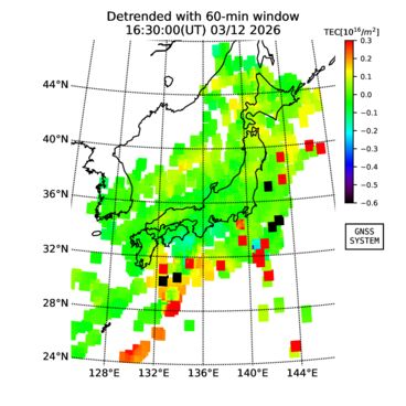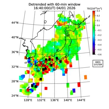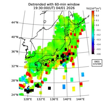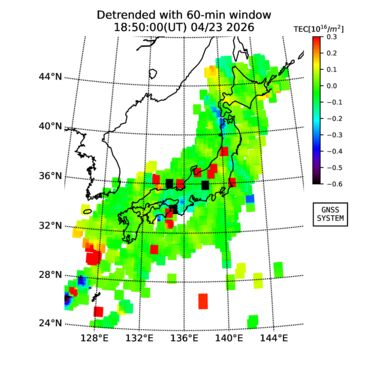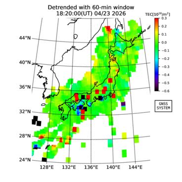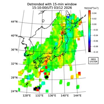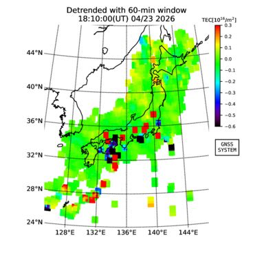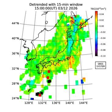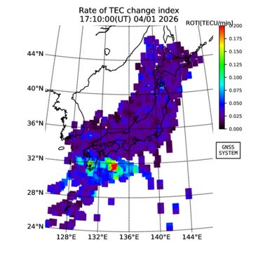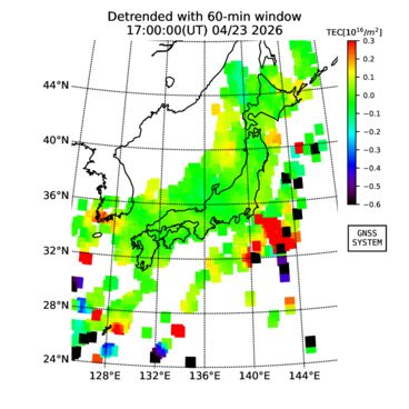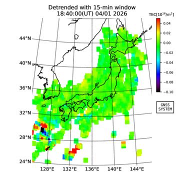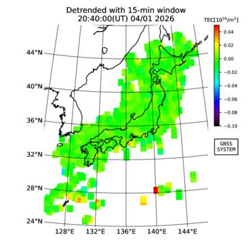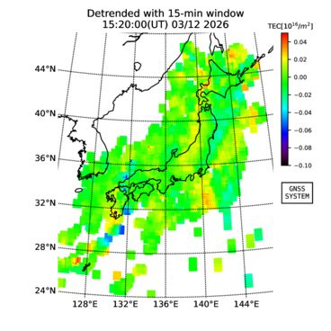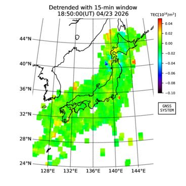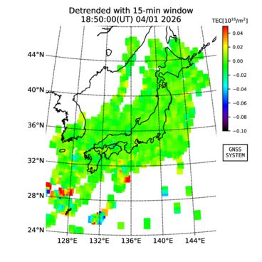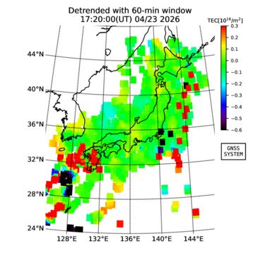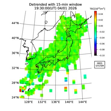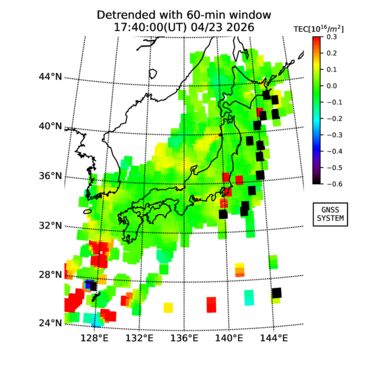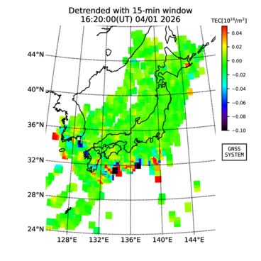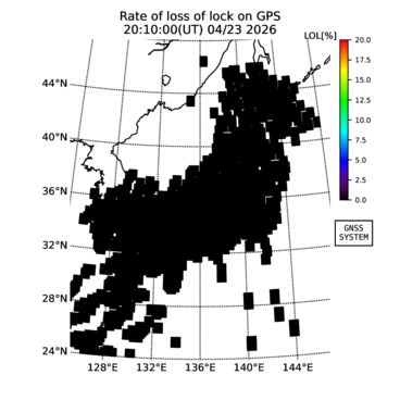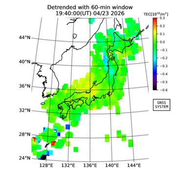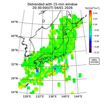 | リアルタイム全電子数(TEC)、TEC変動成分、電離圏電子密度擾乱指数(ROTI)、GPS信号ロック損失率(LOL)の各マップは、電子航法研究所、京都大学、及び名古屋大学の協力のもと、国土地理院のGPS受信機網(GEONET)データを利用してNICTが算出し作成したものです。TEC、TEC変動成分、ROTI、LOLマップは速報値であり、正確な値で無い可能性があることにご注意ください。このページに対するご質問・ご意見等は、