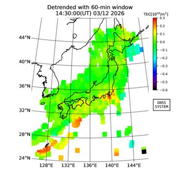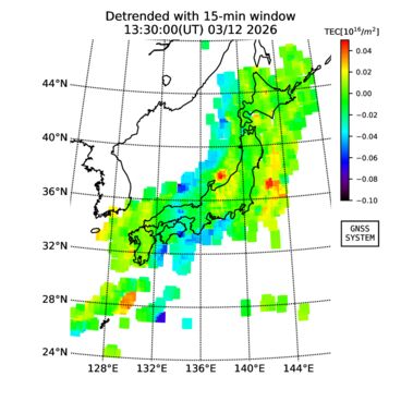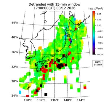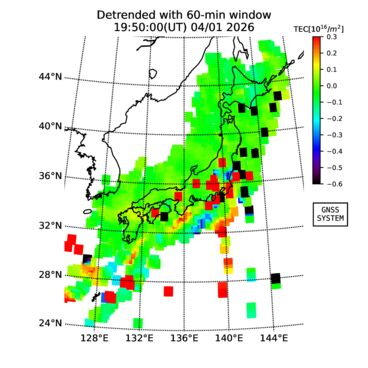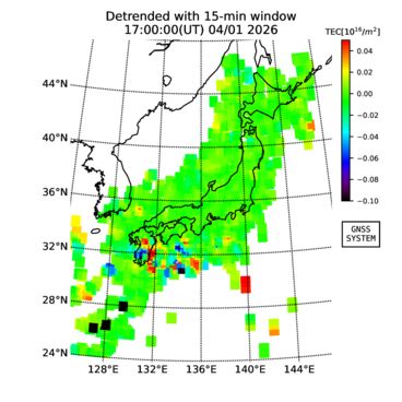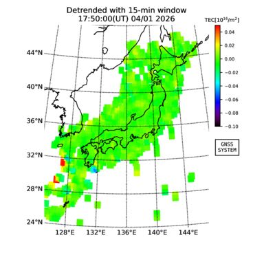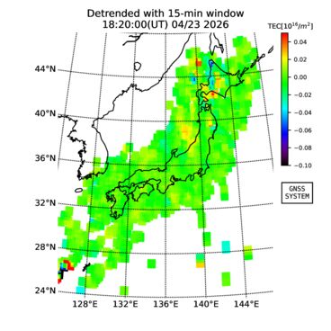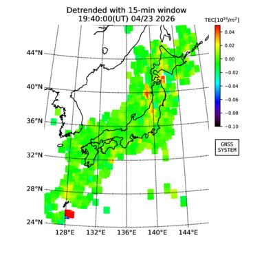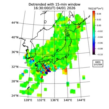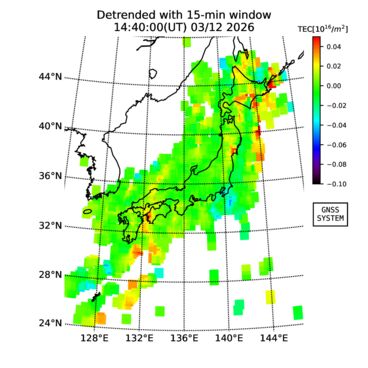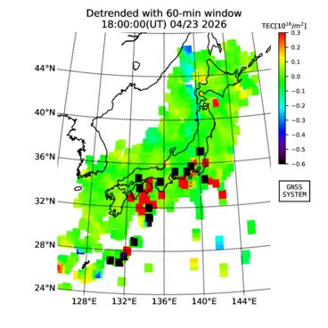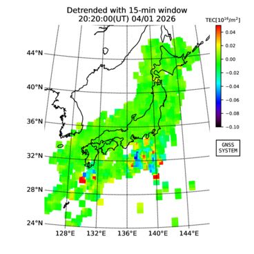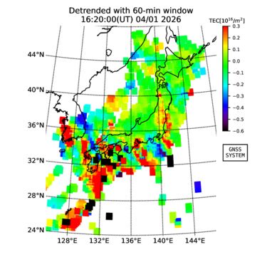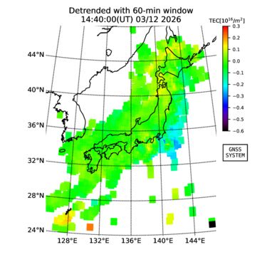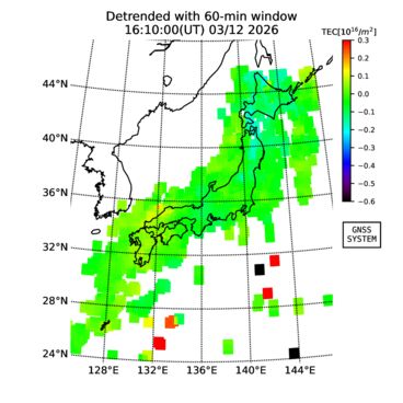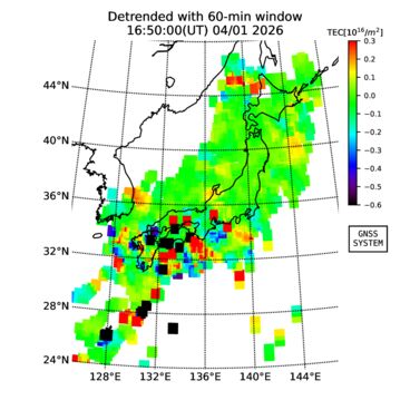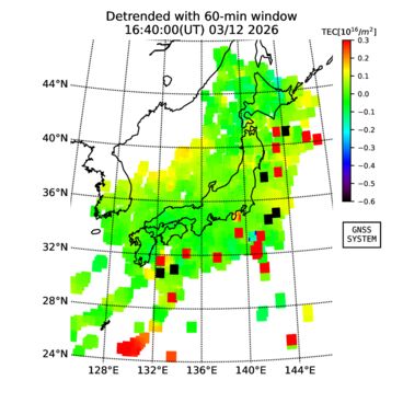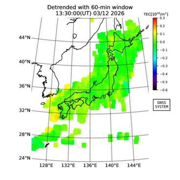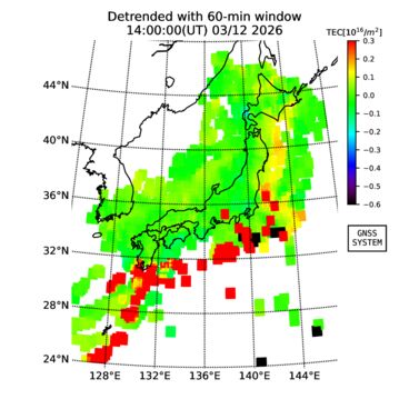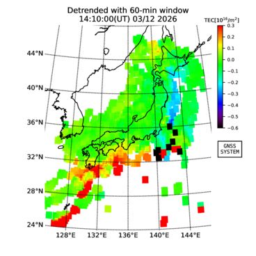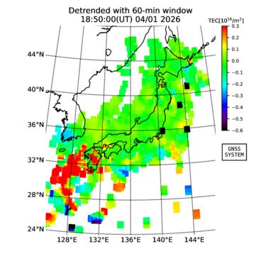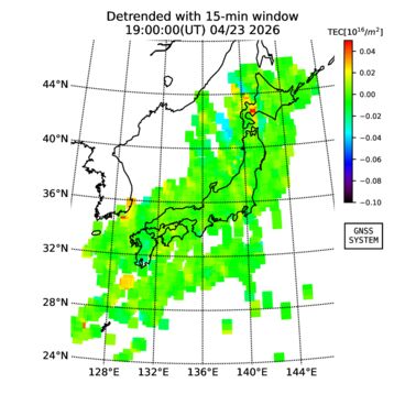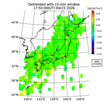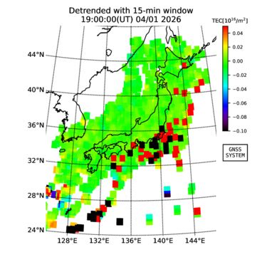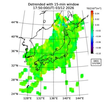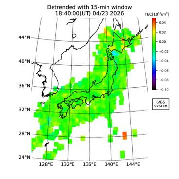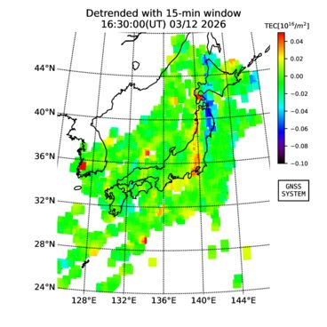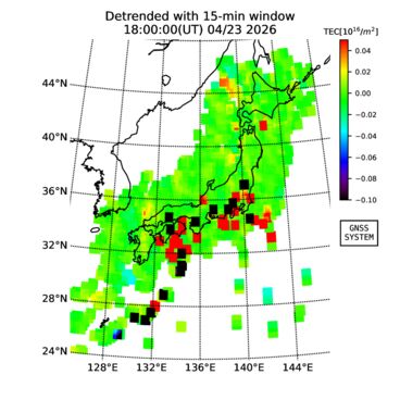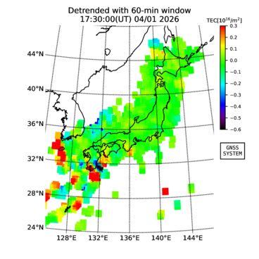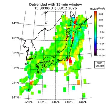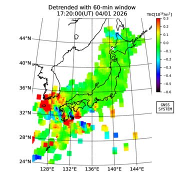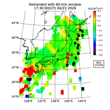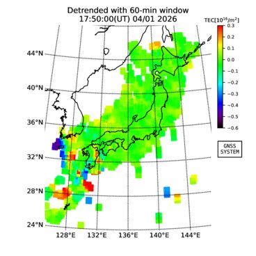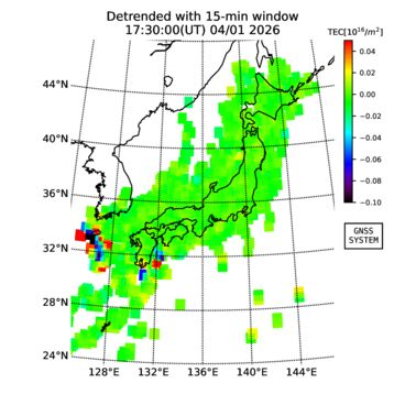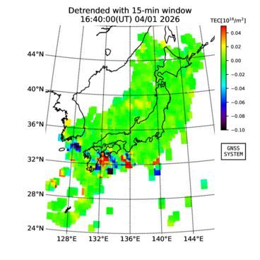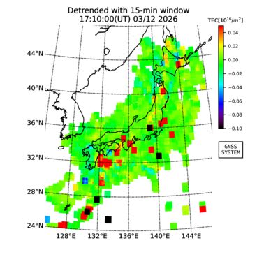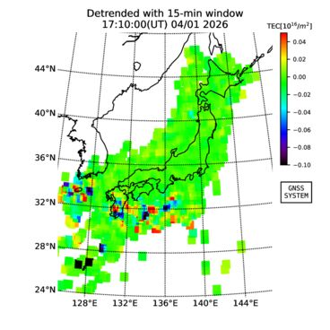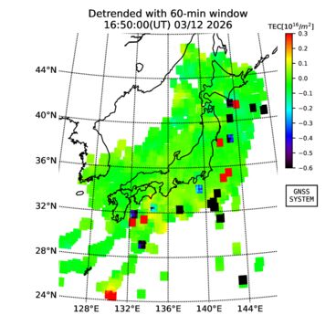 | リアルタイム全電子数(TEC)、TEC変動成分、電離圏電子密度擾乱指数(ROTI)、GPS信号ロック損失率(LOL)の各マップは、電子航法研究所、京都大学、及び名古屋大学の協力のもと、国土地理院のGPS受信機網(GEONET)データを利用してNICTが算出し作成したものです。TEC、TEC変動成分、ROTI、LOLマップは速報値であり、正確な値で無い可能性があることにご注意ください。このページに対するご質問・ご意見等は、