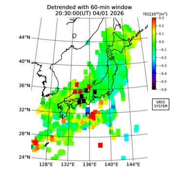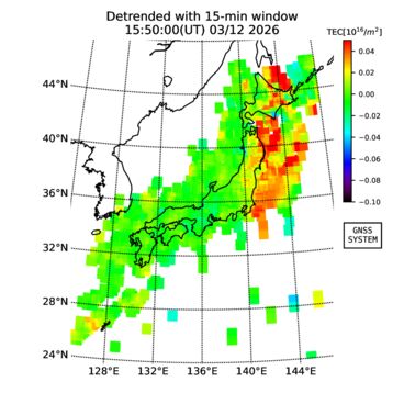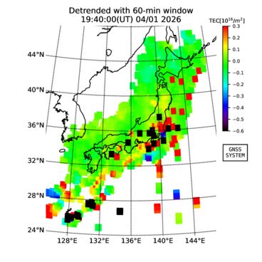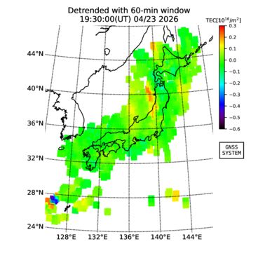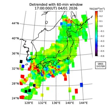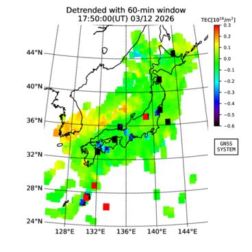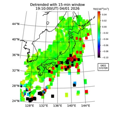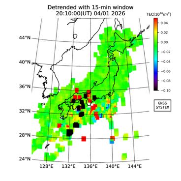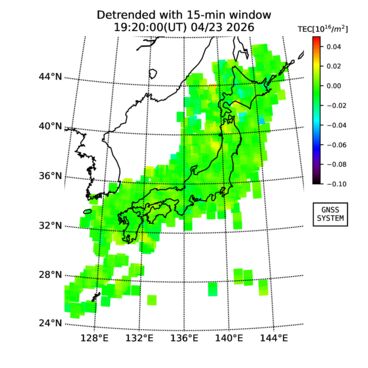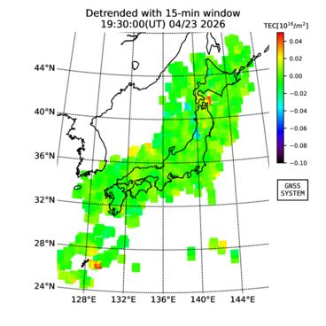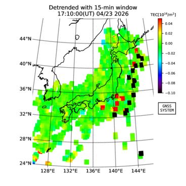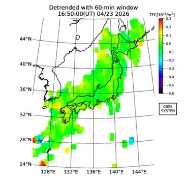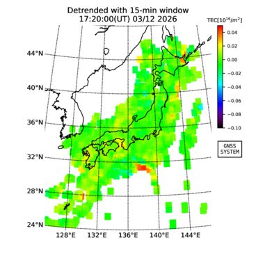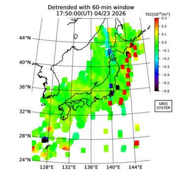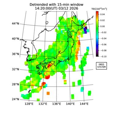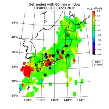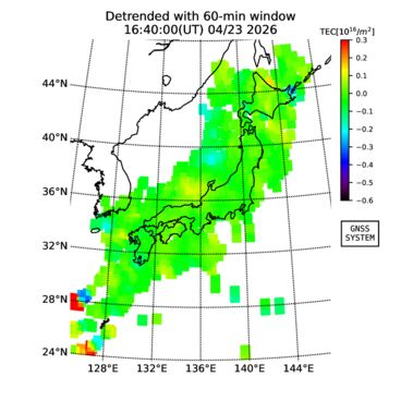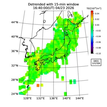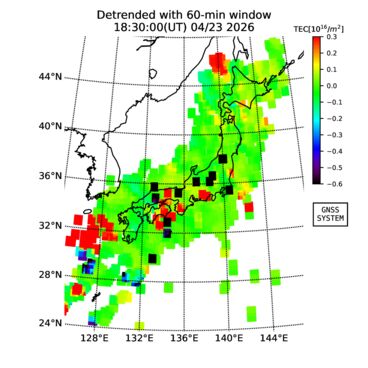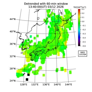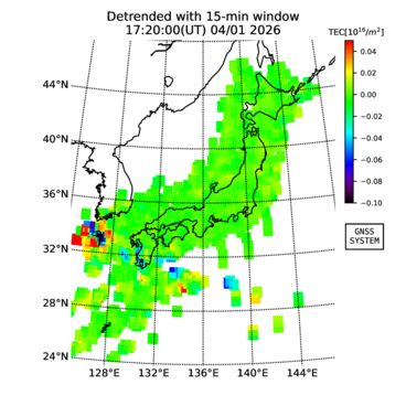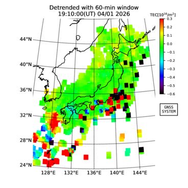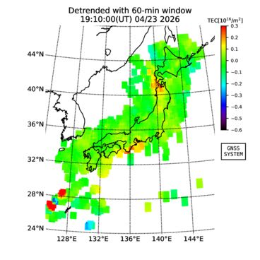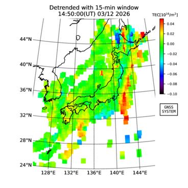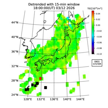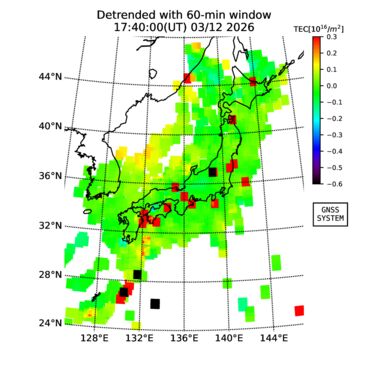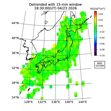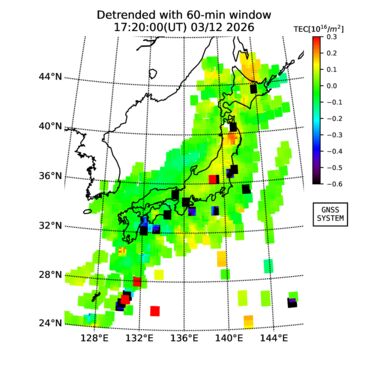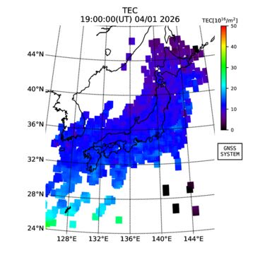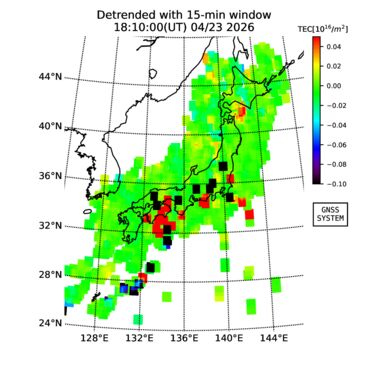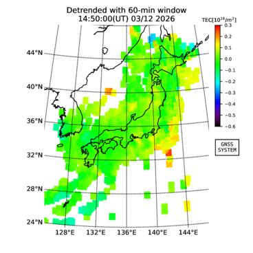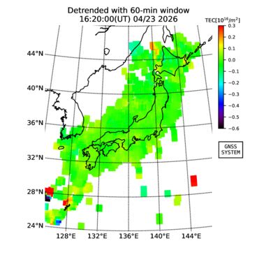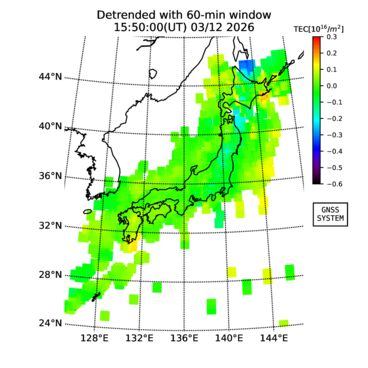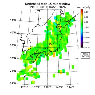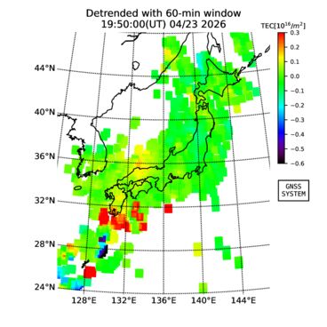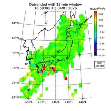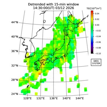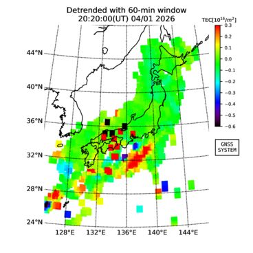 | リアルタイム全電子数(TEC)、TEC変動成分、電離圏電子密度擾乱指数(ROTI)、GPS信号ロック損失率(LOL)の各マップは、電子航法研究所、京都大学、及び名古屋大学の協力のもと、国土地理院のGPS受信機網(GEONET)データを利用してNICTが算出し作成したものです。TEC、TEC変動成分、ROTI、LOLマップは速報値であり、正確な値で無い可能性があることにご注意ください。このページに対するご質問・ご意見等は、