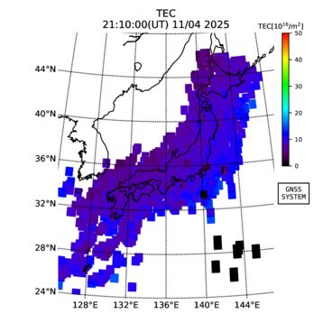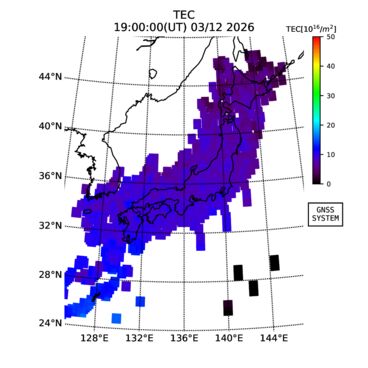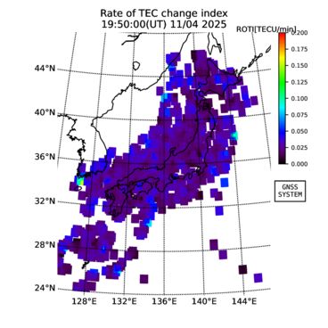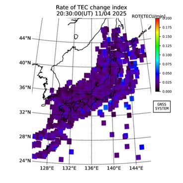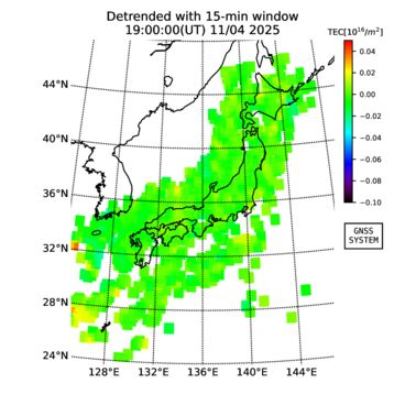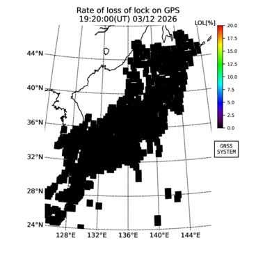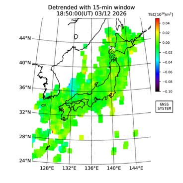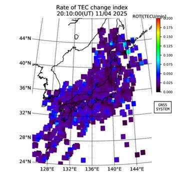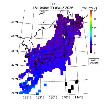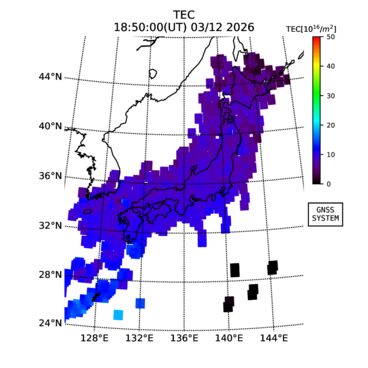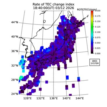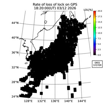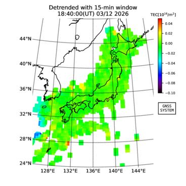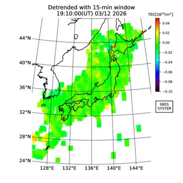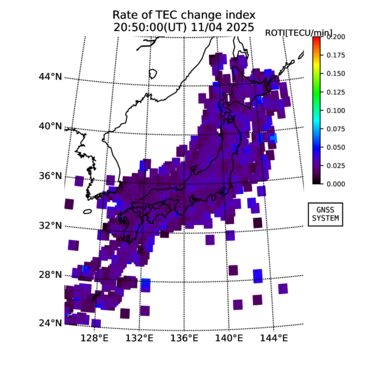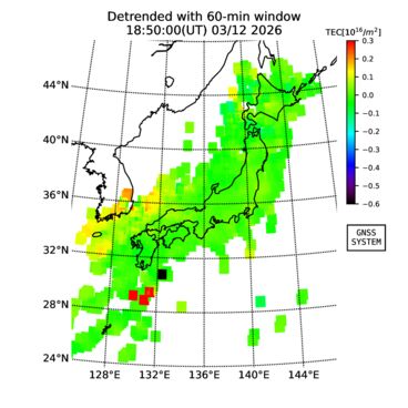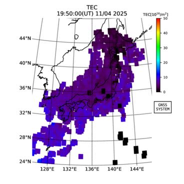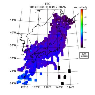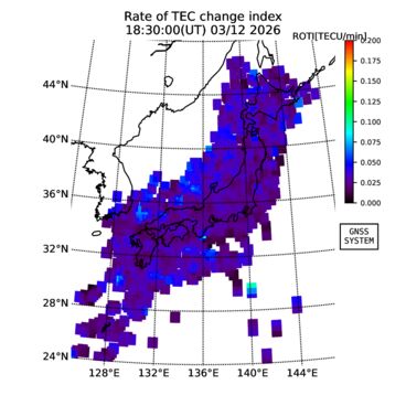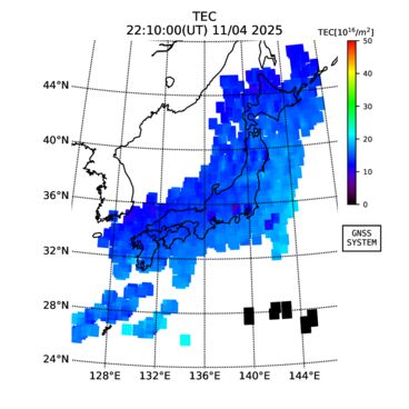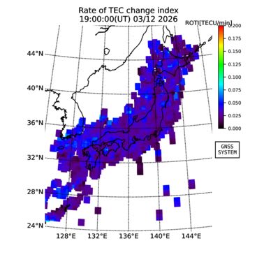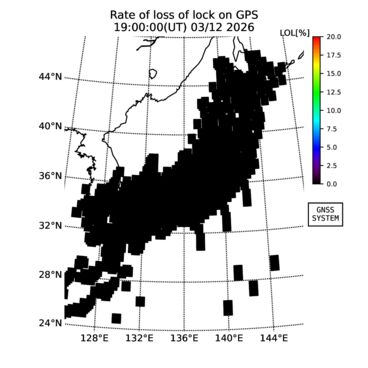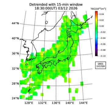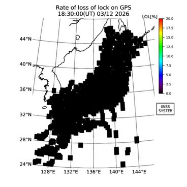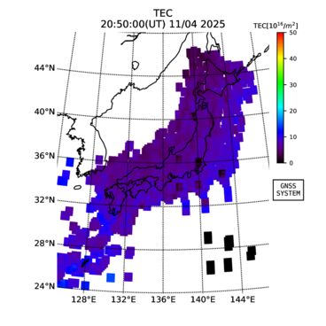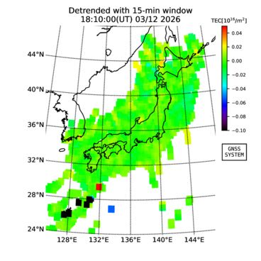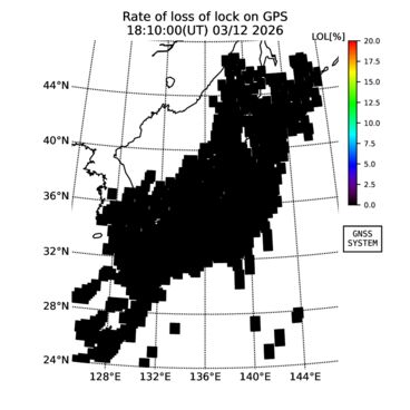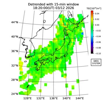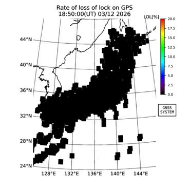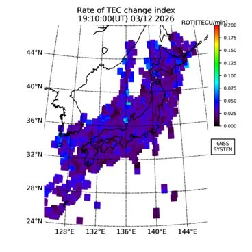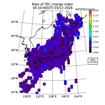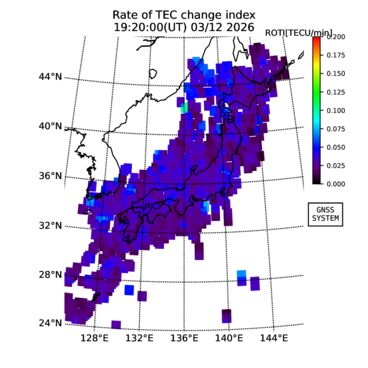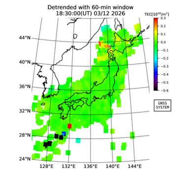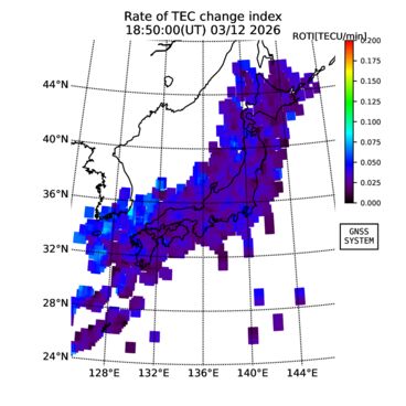 | The two-dimensional maps of total electron content (TEC), detrended TEC, rate of TEC change index (ROTI), and loss of lock on GPS signals (LOL) are made by NICT under collaboration with Electronic Navigation Research Institute (ENRI), Kyoto University and Nagoya University. The TEC data and LOL information are calculated by ENRI using GEONET GPS data operated by Geospatial Information Authority of Japan. The realtime plots in this site have not been fully calibrated. If you have any questions or comments, please e-mail to
