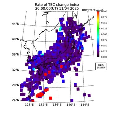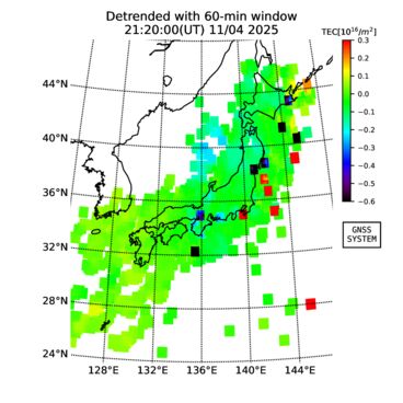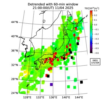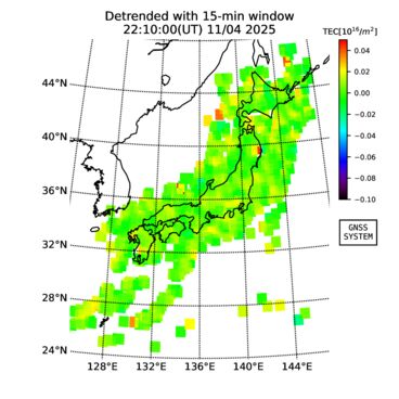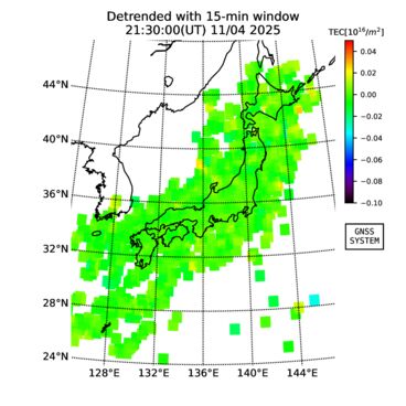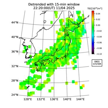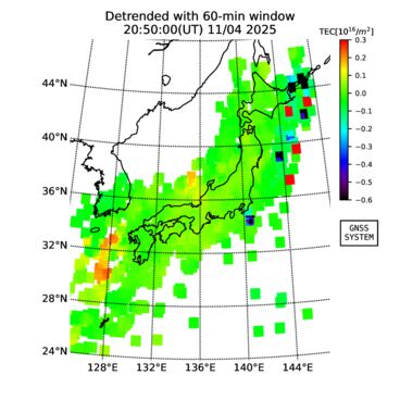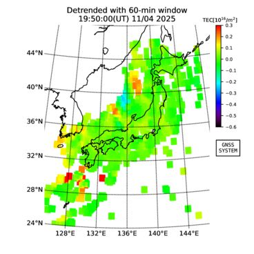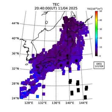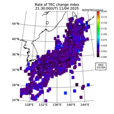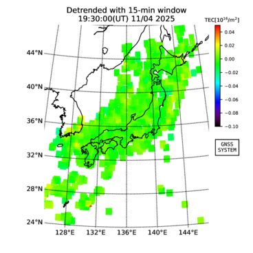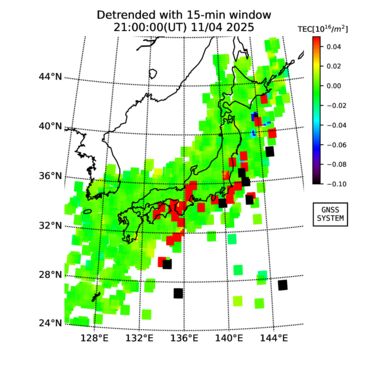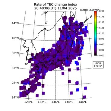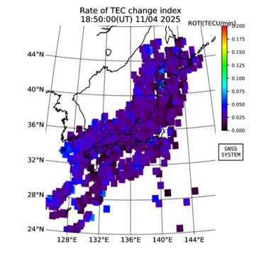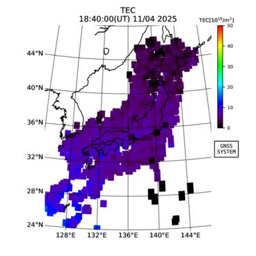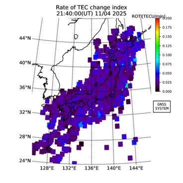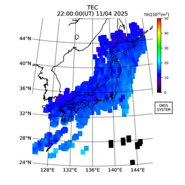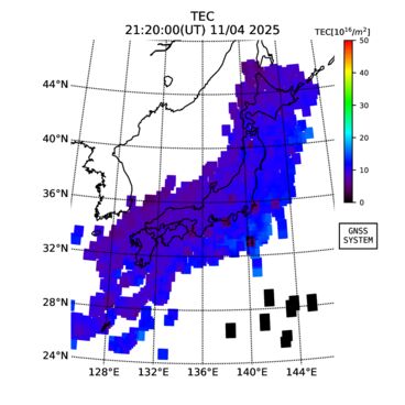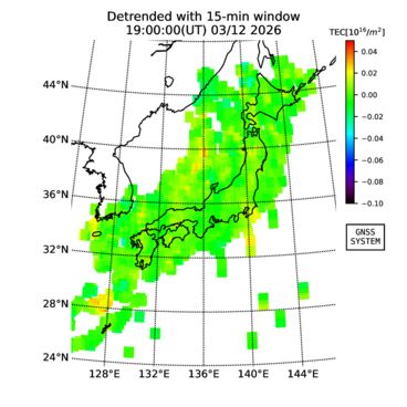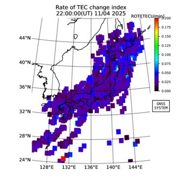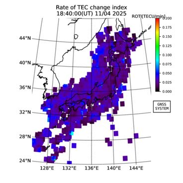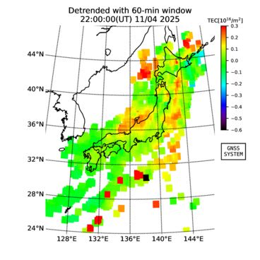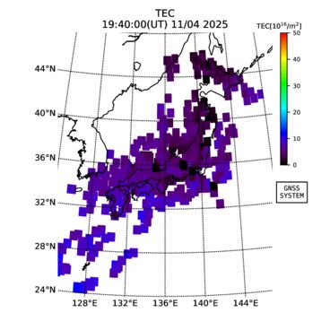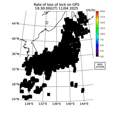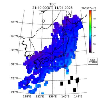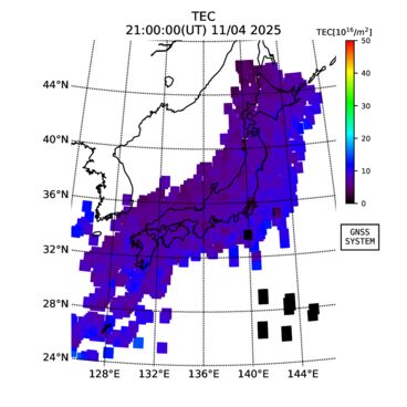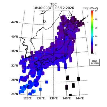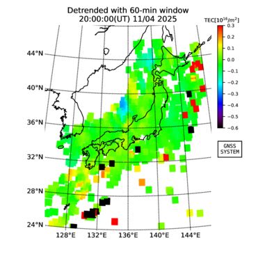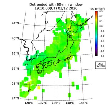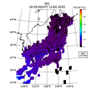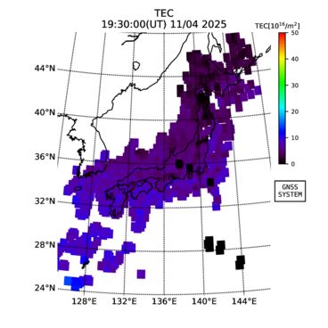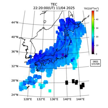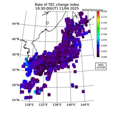 | The two-dimensional maps of total electron content (TEC), detrended TEC, rate of TEC change index (ROTI), and loss of lock on GPS signals (LOL) are made by NICT under collaboration with Electronic Navigation Research Institute (ENRI), Kyoto University and Nagoya University. The TEC data and LOL information are calculated by ENRI using GEONET GPS data operated by Geospatial Information Authority of Japan. The realtime plots in this site have not been fully calibrated. If you have any questions or comments, please e-mail to
