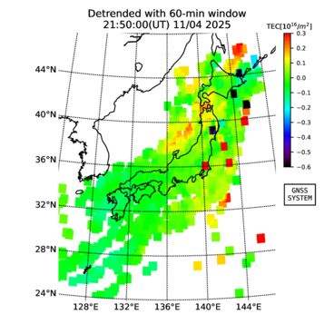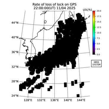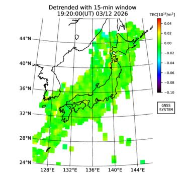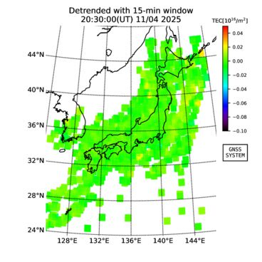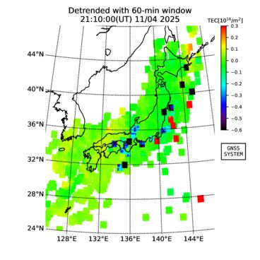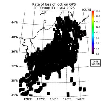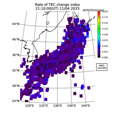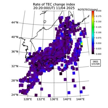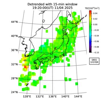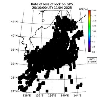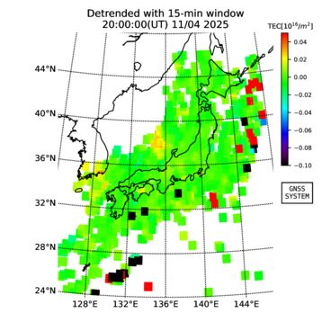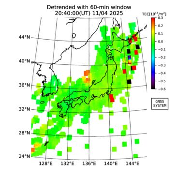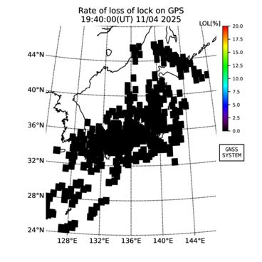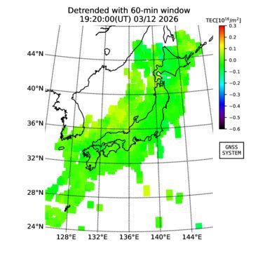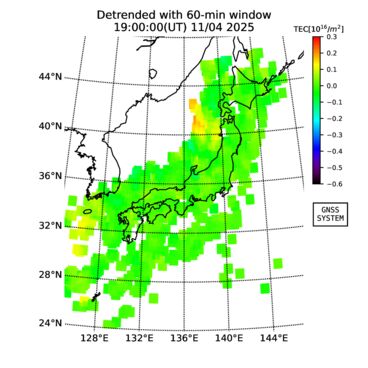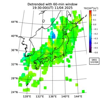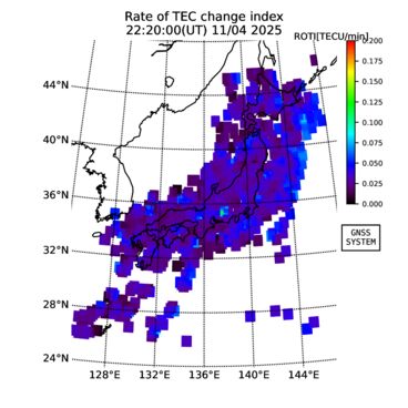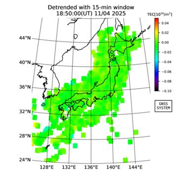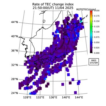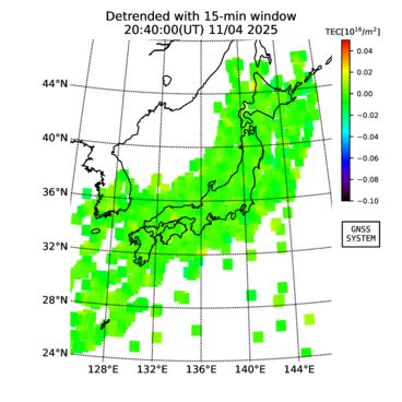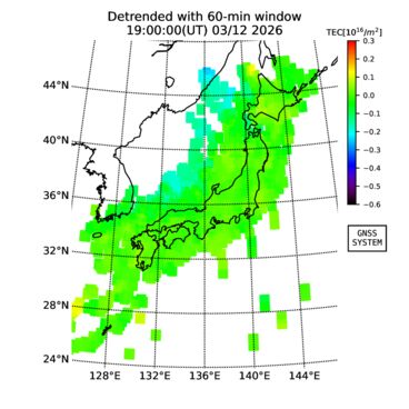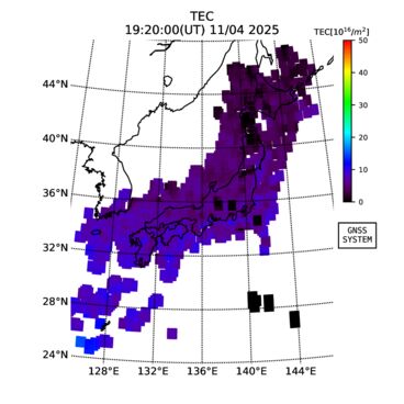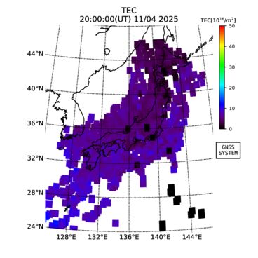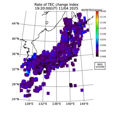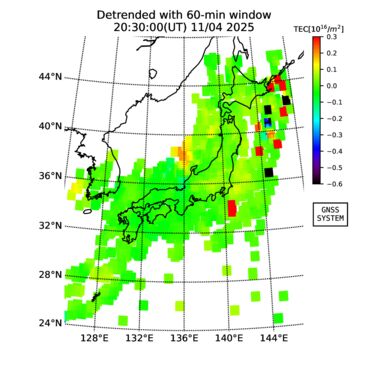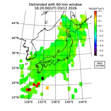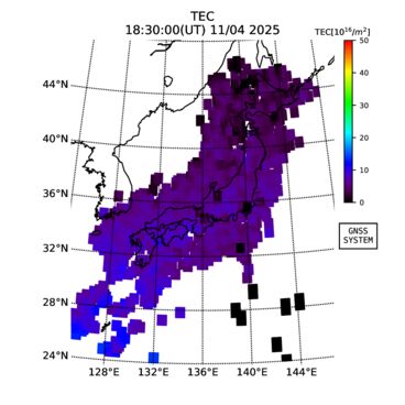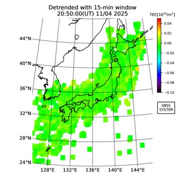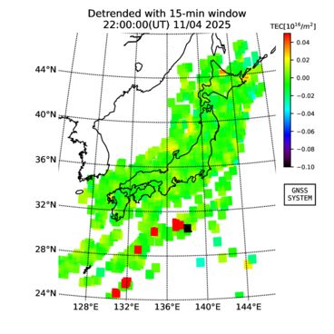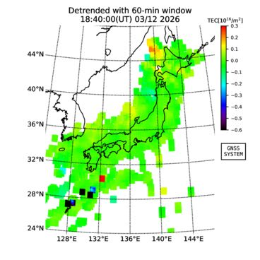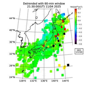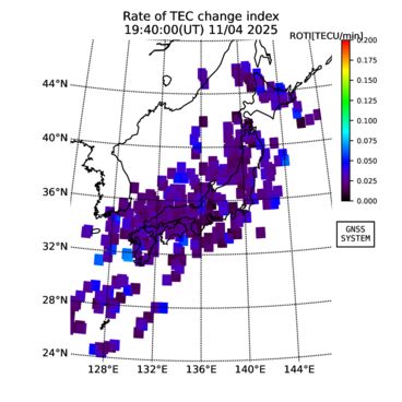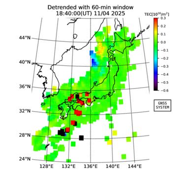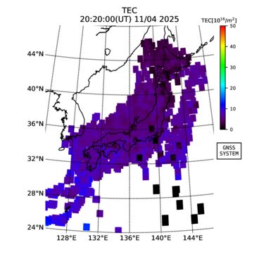 | The two-dimensional maps of total electron content (TEC), detrended TEC, rate of TEC change index (ROTI), and loss of lock on GPS signals (LOL) are made by NICT under collaboration with Electronic Navigation Research Institute (ENRI), Kyoto University and Nagoya University. The TEC data and LOL information are calculated by ENRI using GEONET GPS data operated by Geospatial Information Authority of Japan. The realtime plots in this site have not been fully calibrated. If you have any questions or comments, please e-mail to