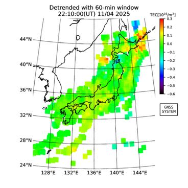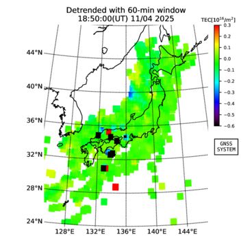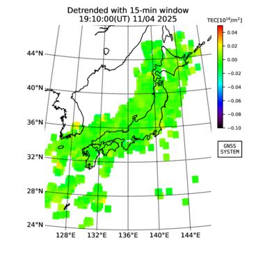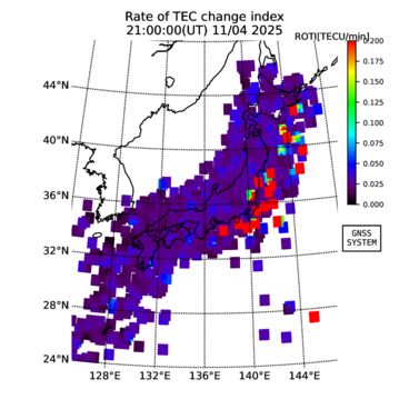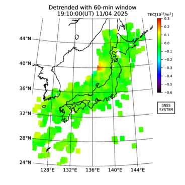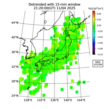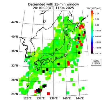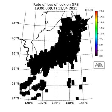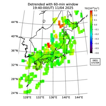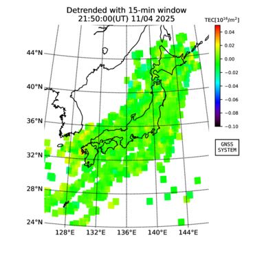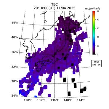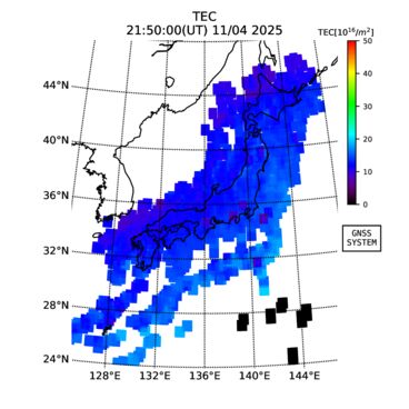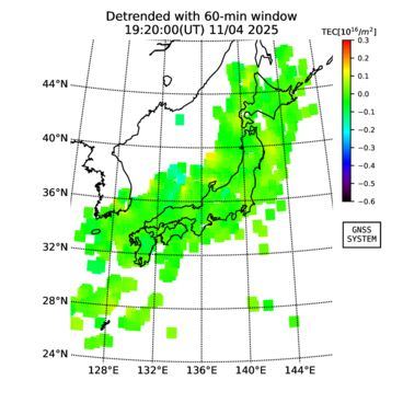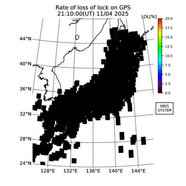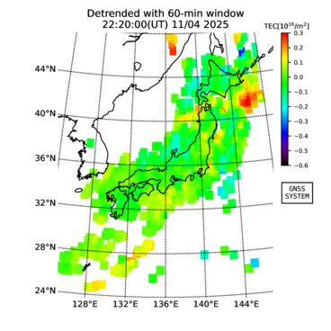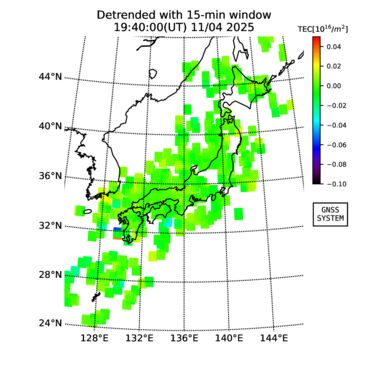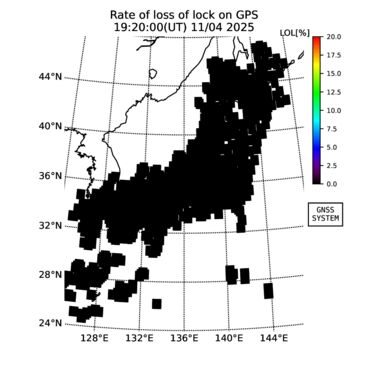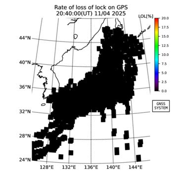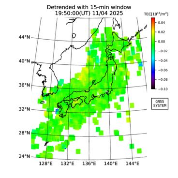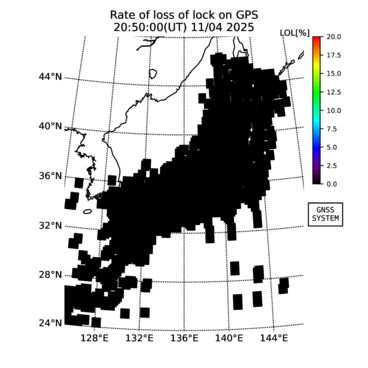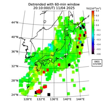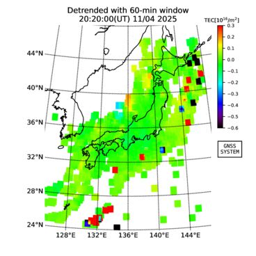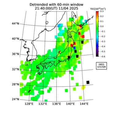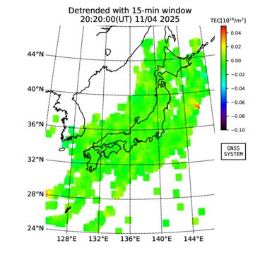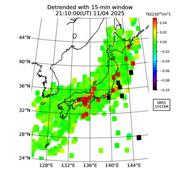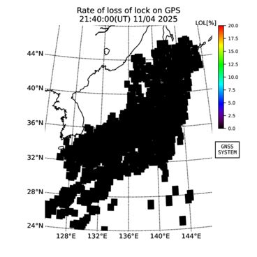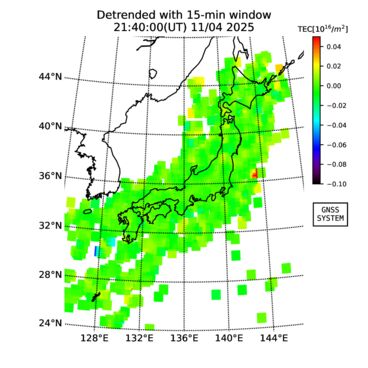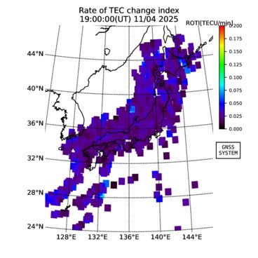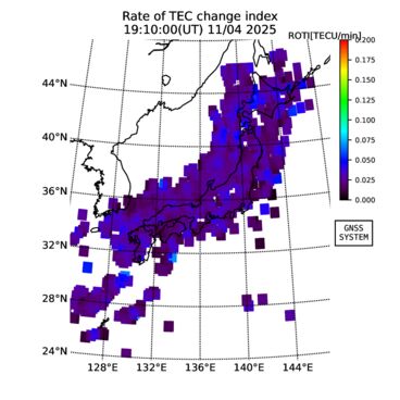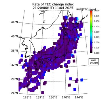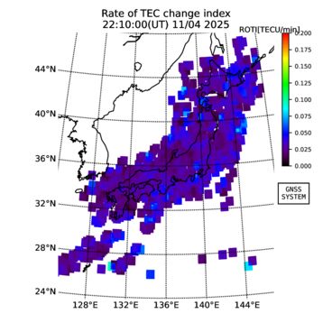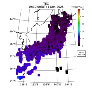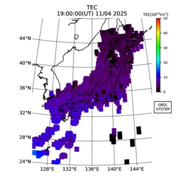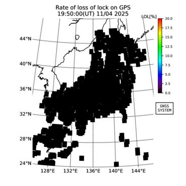 | The two-dimensional maps of total electron content (TEC), detrended TEC, rate of TEC change index (ROTI), and loss of lock on GPS signals (LOL) are made by NICT under collaboration with Electronic Navigation Research Institute (ENRI), Kyoto University and Nagoya University. The TEC data and LOL information are calculated by ENRI using GEONET GPS data operated by Geospatial Information Authority of Japan. The realtime plots in this site have not been fully calibrated. If you have any questions or comments, please e-mail to