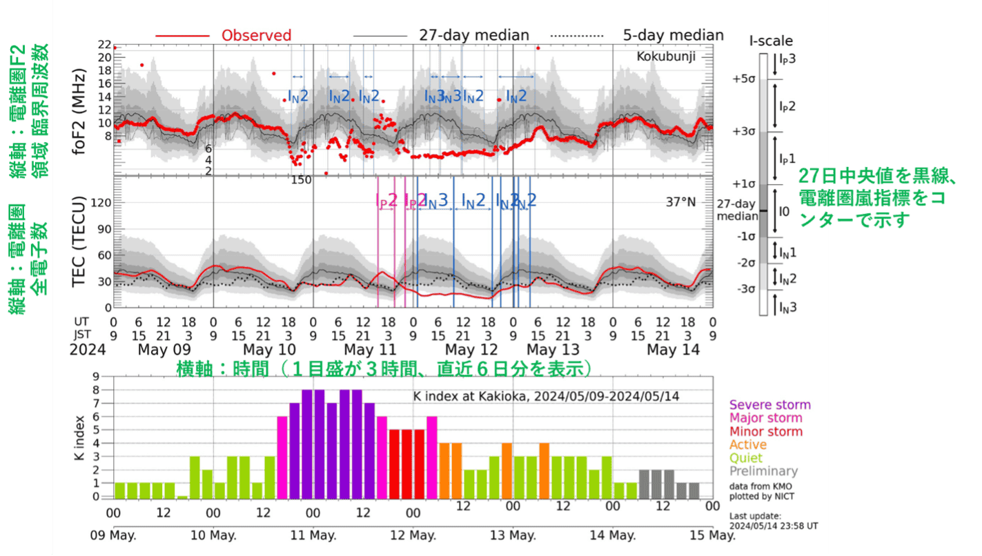 上段のグラフは、国分寺(東京)のイオノゾンデ*1で観測されたF2領域*2臨界周波数(foF2)*3の時間変化を示しています。 foF2はF2領域の電子密度と連動して増減します。 中段のグラフは、国土地理院GPS受信機網(GEONET)データを用いて算出した、中緯度帯(北緯37度付近)の電離圏全電子数(Total Electron Content:TEC)*4の時間変化です。 電離圏の電子密度・TECは、昼間に大きく、夜間に小さくなります。 さらに、場所・季節・太陽活動によっても変化し、磁気嵐に伴う顕著な乱れ(電離圏嵐)も起こります。 NICTでは「電離圏嵐指標(I-scale)」を用いて電離圏嵐の発生を判定しています。 この指標は、過去27日間の中央値(図中の黒線)に比べて、観測値(図中の赤点・赤線)がどれだけずれているかを統計的な尺度(図中のグレーコンター)で示します。 電子密度が増加する嵐(正相嵐)をIP1~IP3、電子密度が減少する嵐(負相嵐)をIN1~IN3で表します(数字が大きいほど規模が大きい)。