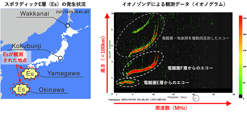 右は国内4か所の電離圏観測装置(イオノゾンデ)*1による最新データを示し、左はスポラディックE層(Es層)*2の発生状況を示します。