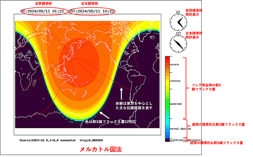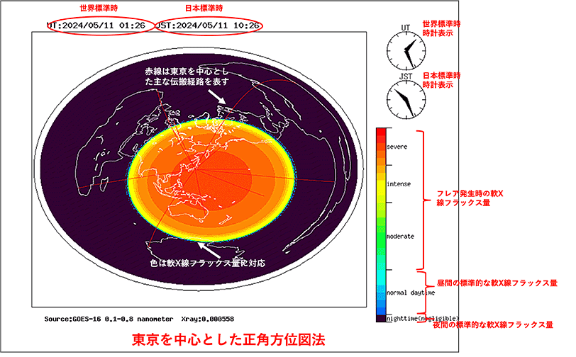 米国NOAA(海洋大気庁)の運用するGOES衛星により観測された軟X線フラックスの値を、 太陽天頂角を考慮して各地点に補正し、東京を中心とした正角方位図法*1で表示したもの。 通常、軟X線フラックスは青~水色で示される範囲にありますが、太陽フレアが発生すると黄~赤色の範囲に増加します。 太陽X線の入射が強まった領域ではデリンジャー現象*2が発生し、HF帯の電波の吸収が起こります。 図中の赤線は、例として東京からの電波伝搬経路を示します。 デリンジャー現象の発生領域が重なるとこれらの通信が途絶する場合があります。