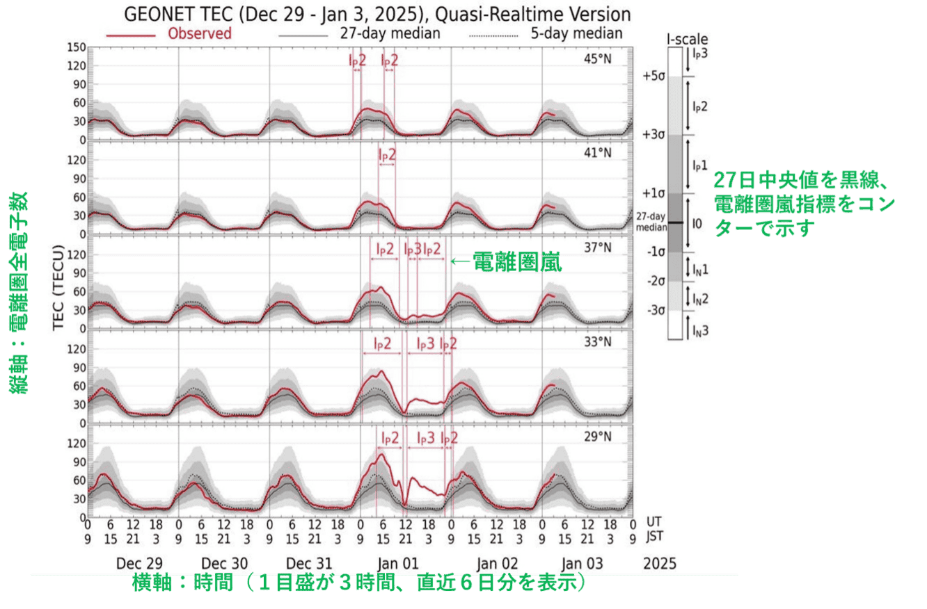 国土地理院GPS受信機網(GEONET)データを利用して算出した電離圏全電子数(Total Electron Content:TEC)* の時間変化を示しています。 日本上空の異なる緯度帯におけるTECの変動を、上から順に、北緯43-47度、北緯39-43度、北緯35-39度、北緯31-35度、北緯27-31度ごとに表示しています。 電離圏の電子数は、昼間に多く、夜間に少なくなります。 さらに、場所・季節・太陽活動によっても変化し、磁気嵐に伴う顕著な乱れ(電離圏嵐)も起こります。 NICTでは「電離圏嵐指標(I-scale)」を用いて電離圏嵐の発生を判定しています。 この指標は、過去27日間の中央値(図中の黒線)に比べて、観測値(図中の赤線)がどれだけずれているかを統計的な尺度(図中のグレーコンター)で示します。 電子密度が増加する嵐をIP1~IP3、電子密度が減少する嵐をIN1~IN3で表します(数字が大きいほど規模が大きい)。