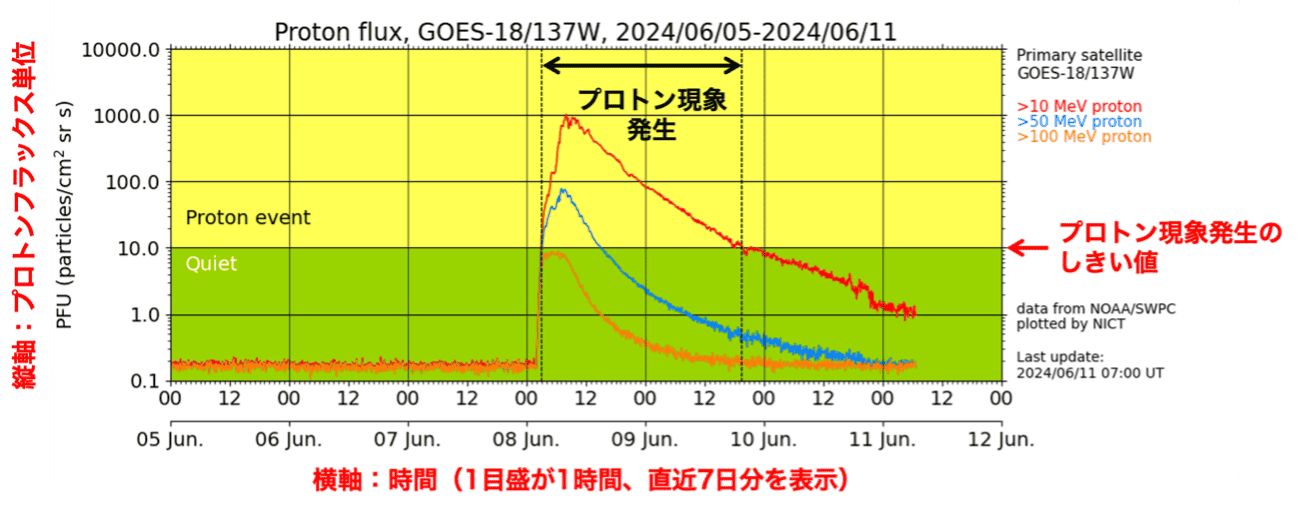 米国NOAA(海洋大気庁)の運用するGOES衛星による、 静止軌道(高度約36,000km)上の高エネルギープロトンの観測値で、 プロトンフラックス単位(PFU *)で表されます。 太陽フレアやコロナ質量放出(CME)にともない、 10MeV以上の高エネルギープロトンの観測値が10PFUを上回る状態を「プロトン現象」と呼んでいます。 NICT宇宙天気情報サービスでは、 プロトン現象の発生時と終了時に臨時情報を配信しています。